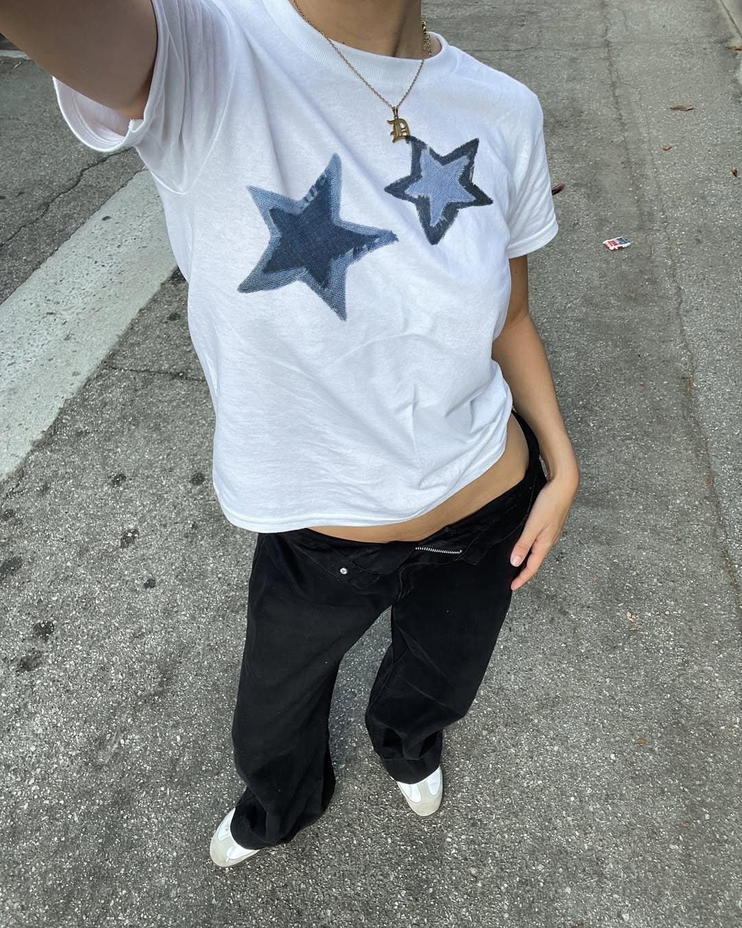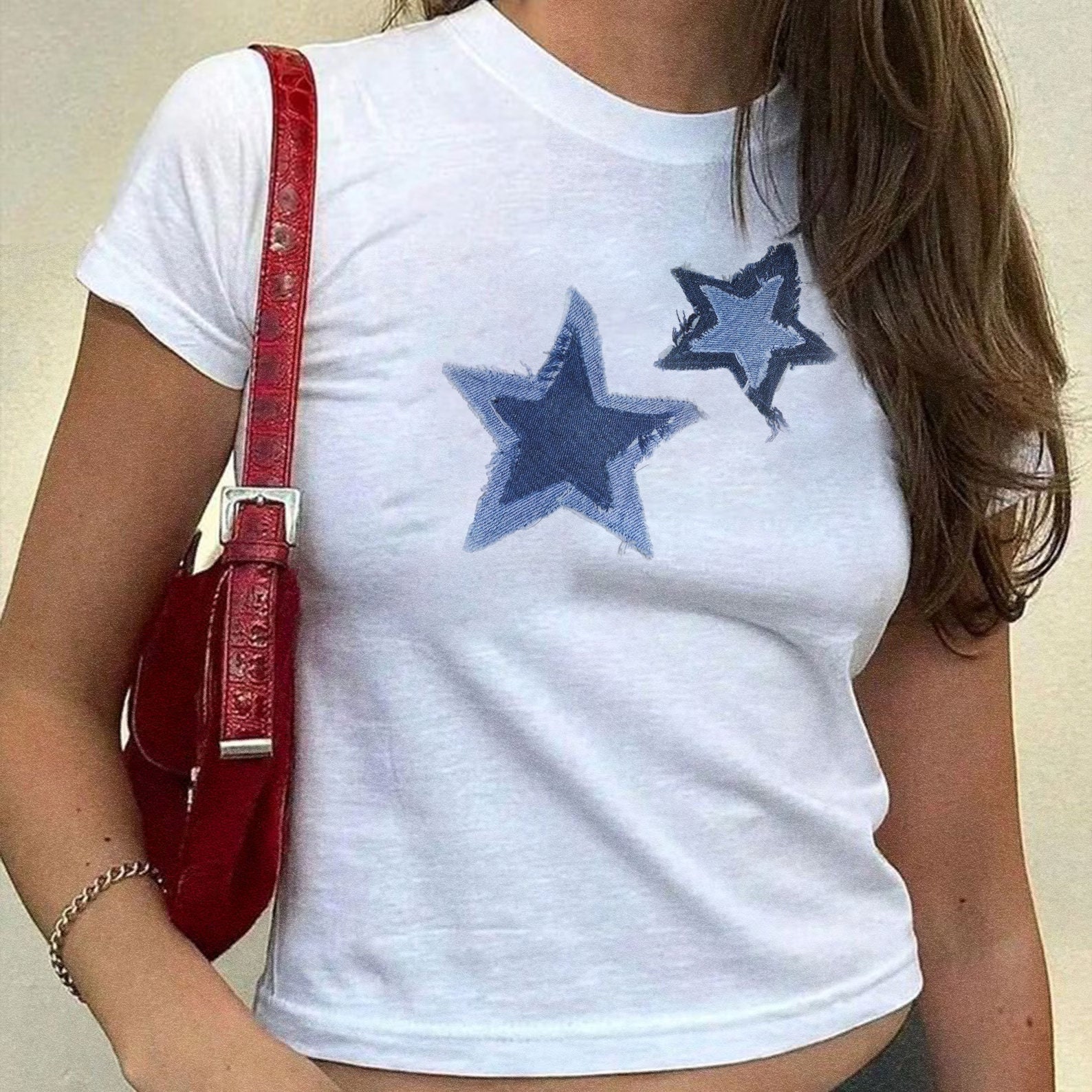 Blue Denim Print Stars Baby Tee | Denim Star Graphic Print Baby Tee Y2K Coquette Cute Tshirt Downtown Girl Boho Trendy Retro 90s Shirt
