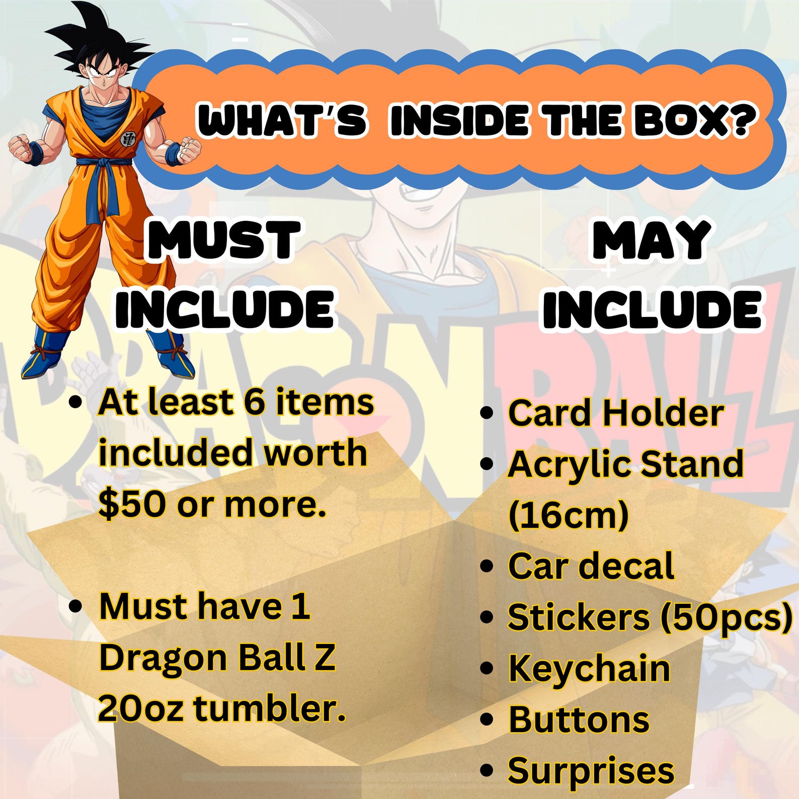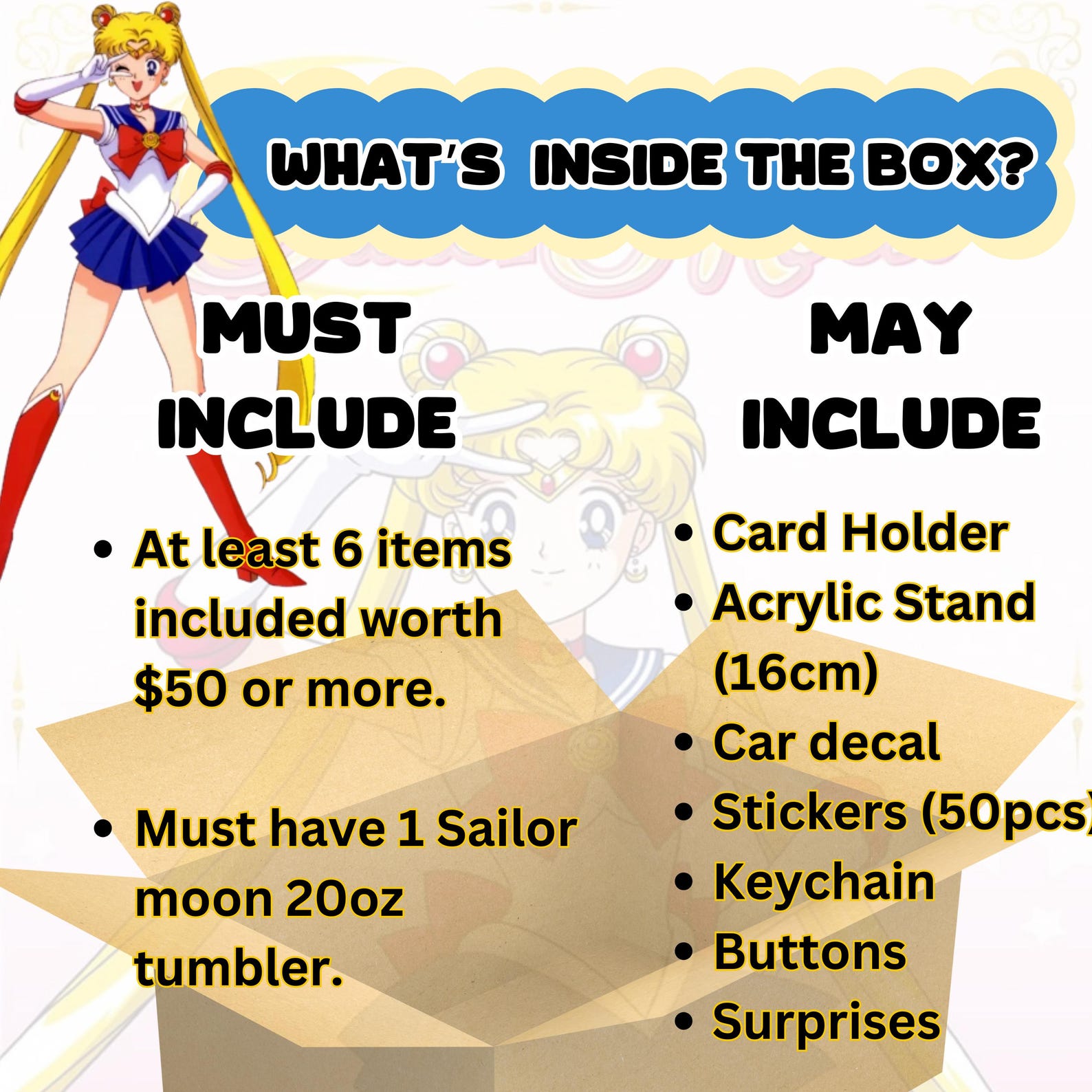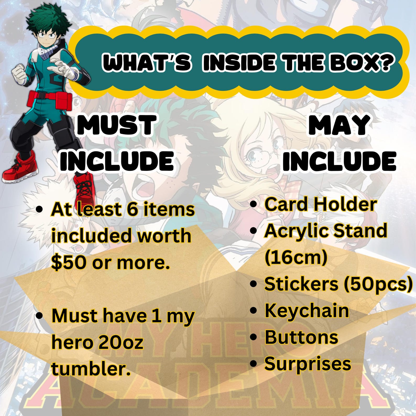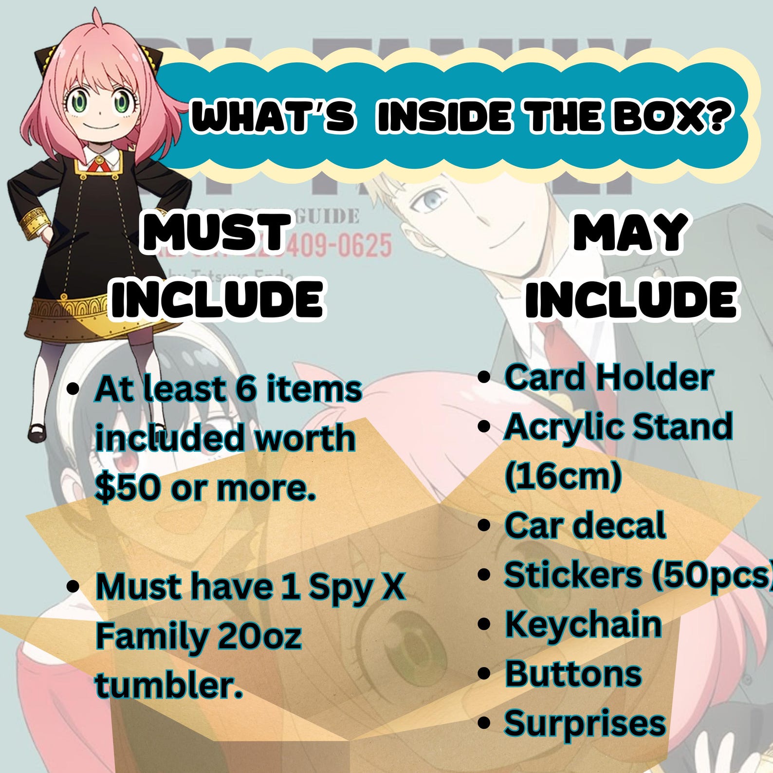 All items in this Anime Mystery Box are selected at random however we will ensure that the value of the items present in the box will never be less than those shown in the descriptions.