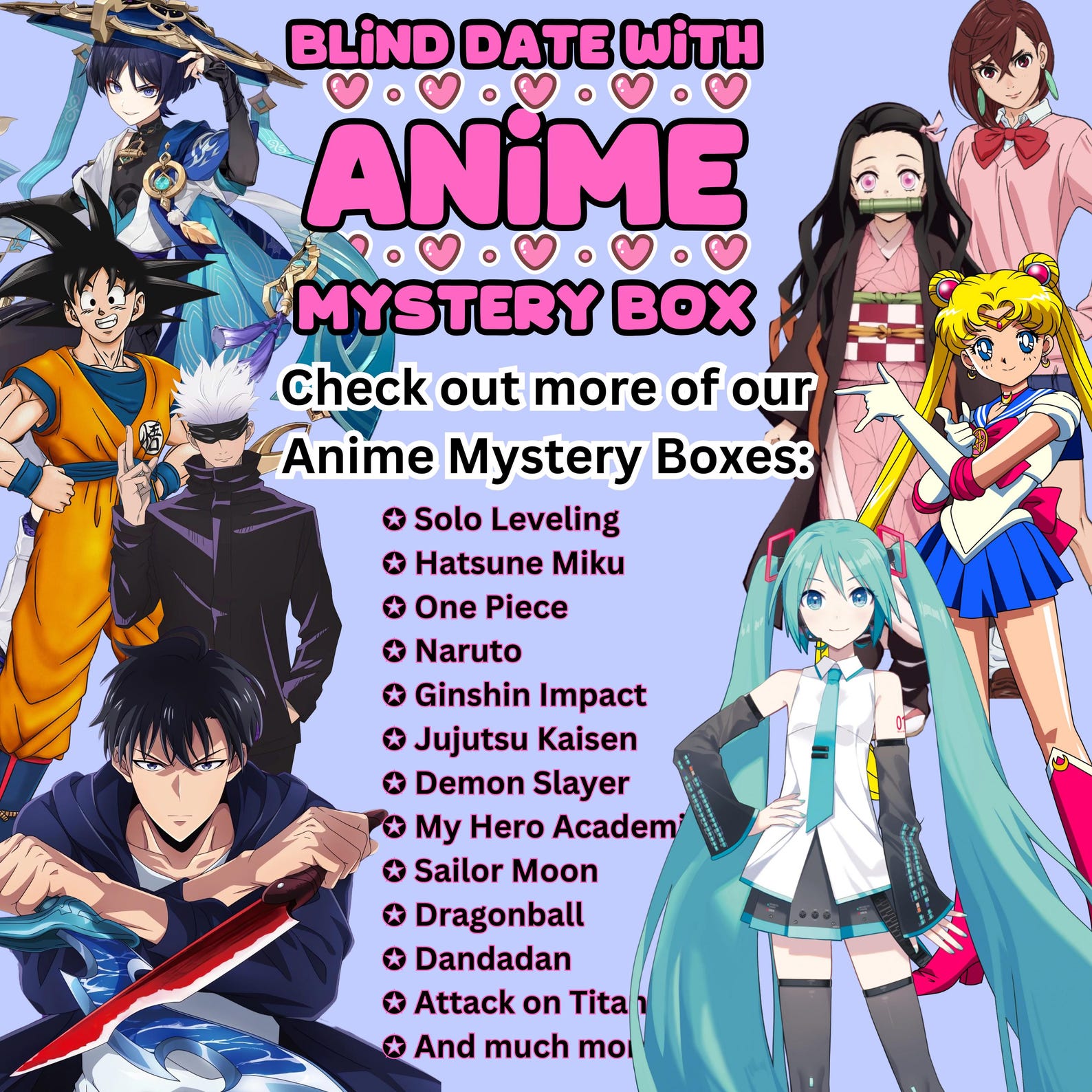 Every mystery box is different, but each one is guaranteed to delight! You’ll receive a mix of Anime themed items and plenty of fun to unbox.