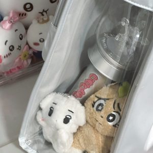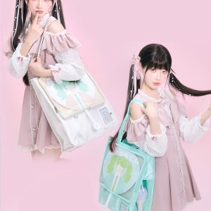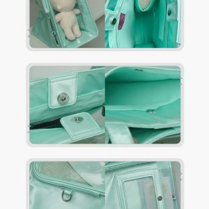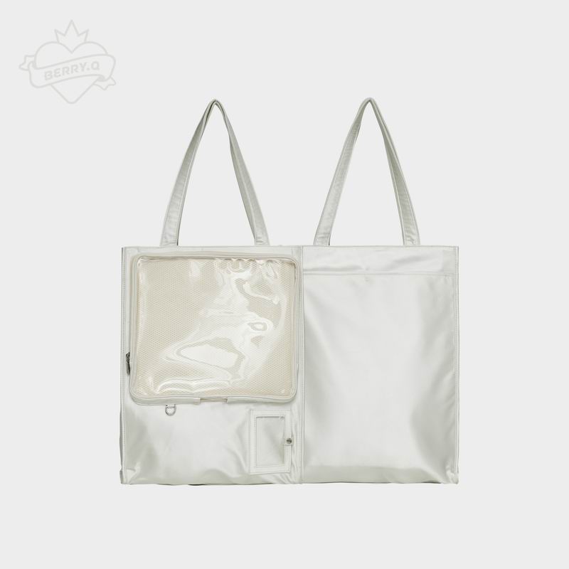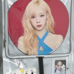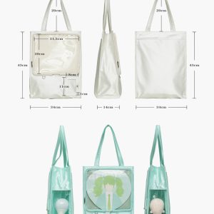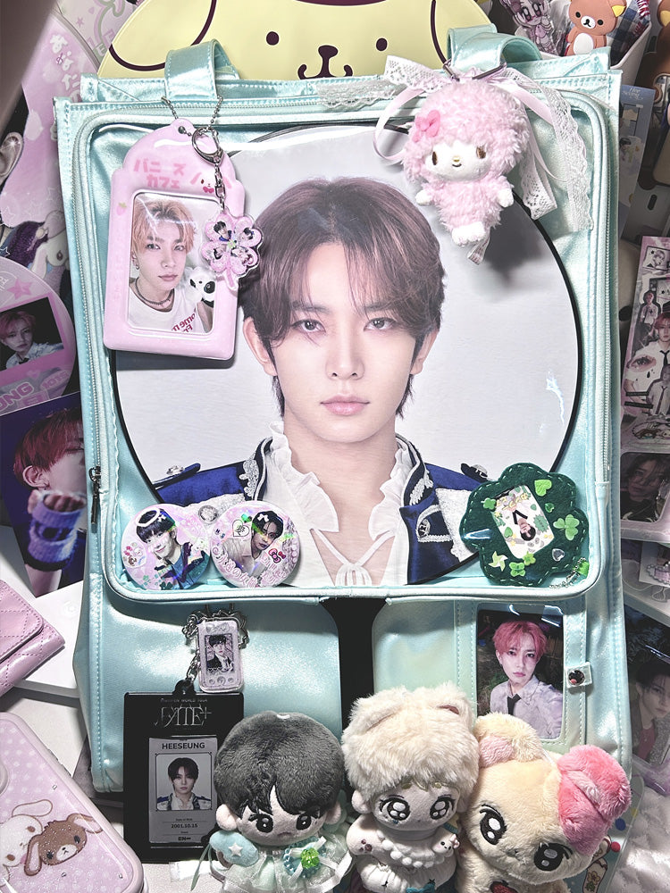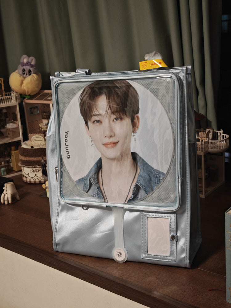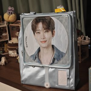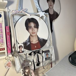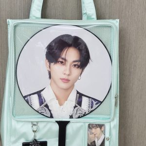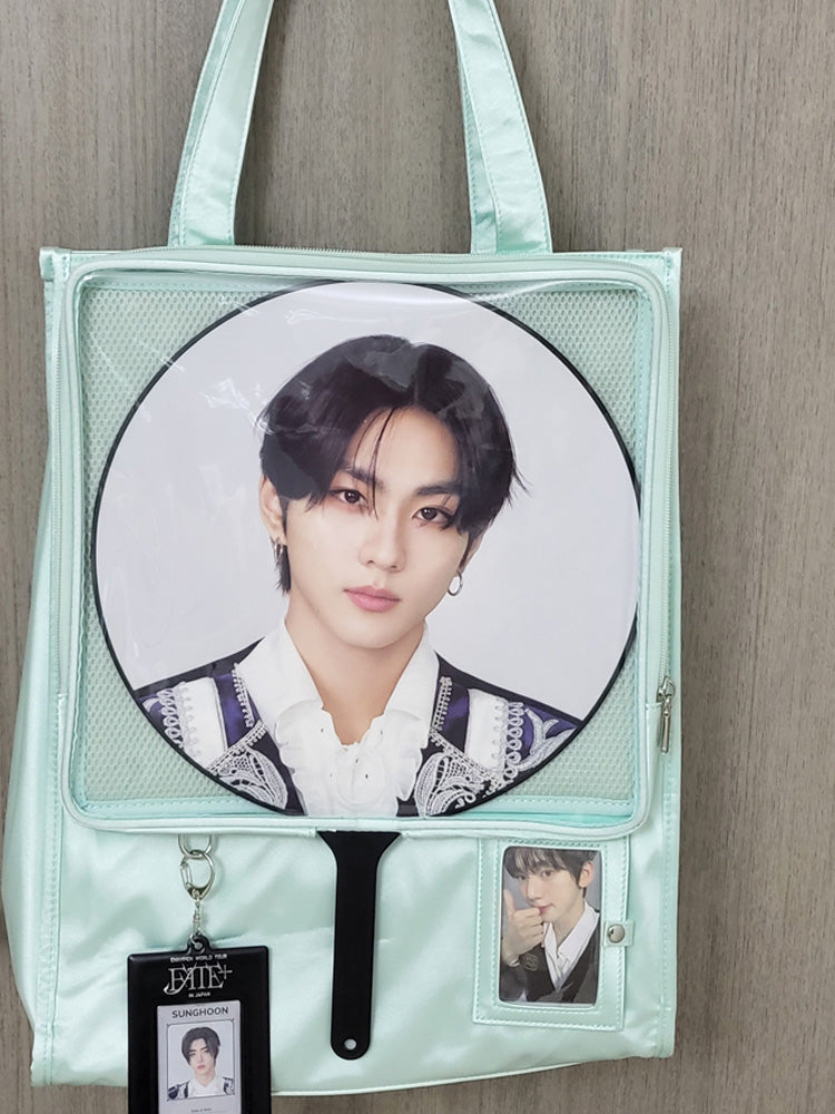Made from satin with a PVC transparent window, this bag features a magnetic closure and can be used as a shoulder bag or handbag. It includes a separate side display window for light sticks or plush dolls. The transparent layer accommodates items up to 30cm in diameter. Available in 7 colors.