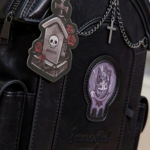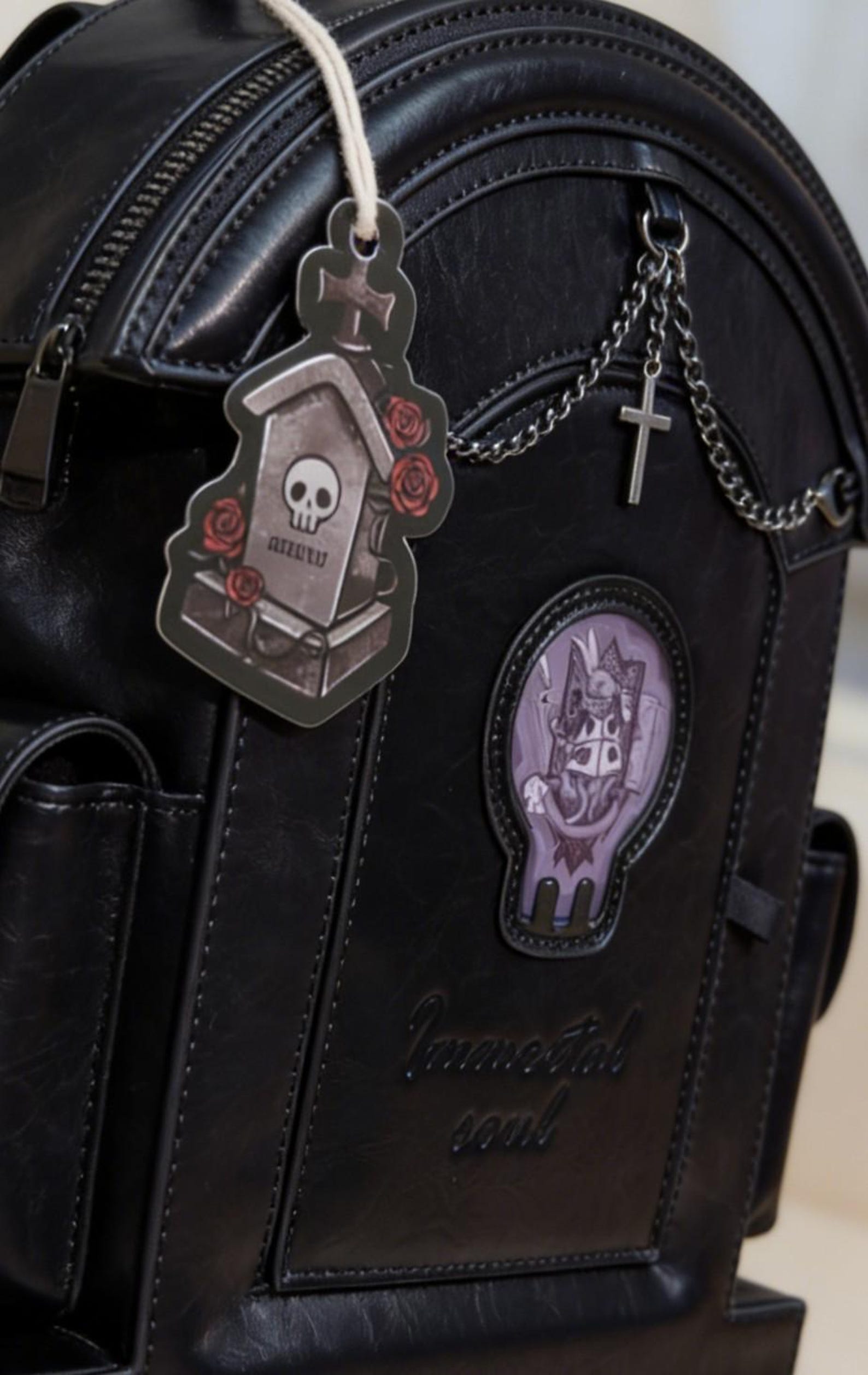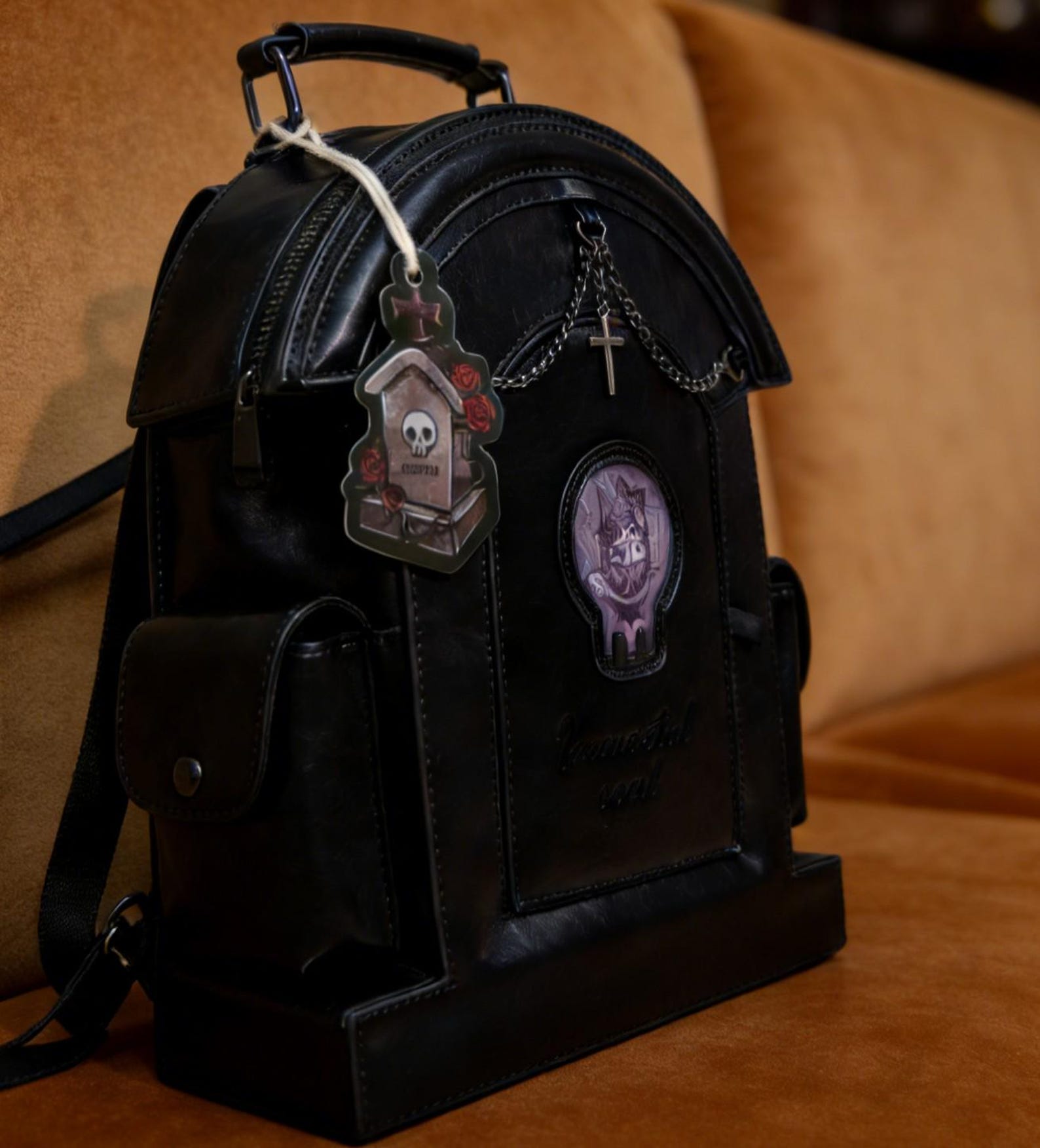 The tombstone-inspired design gives the bag a mysterious and elegant aesthetic, making it perfect for those who embrace dark lolita, gothic, and alternative fashion. The front display window allows you to showcase your favorite anime pins, dolls, or keychains, turning it into a personalized shrine bag.