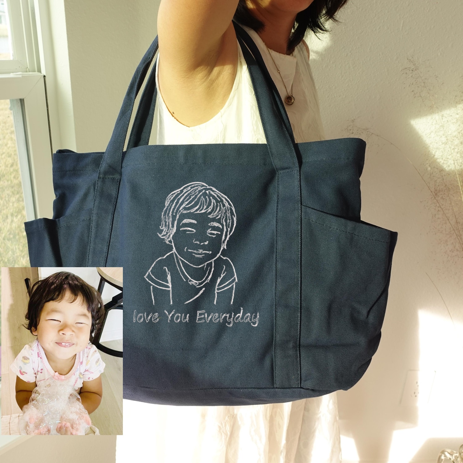 Custom Portraits: Our exquisite craftsmanship transforms your cherished photos into finely embroidered portraits, adding a unique touch to your tote bag.
