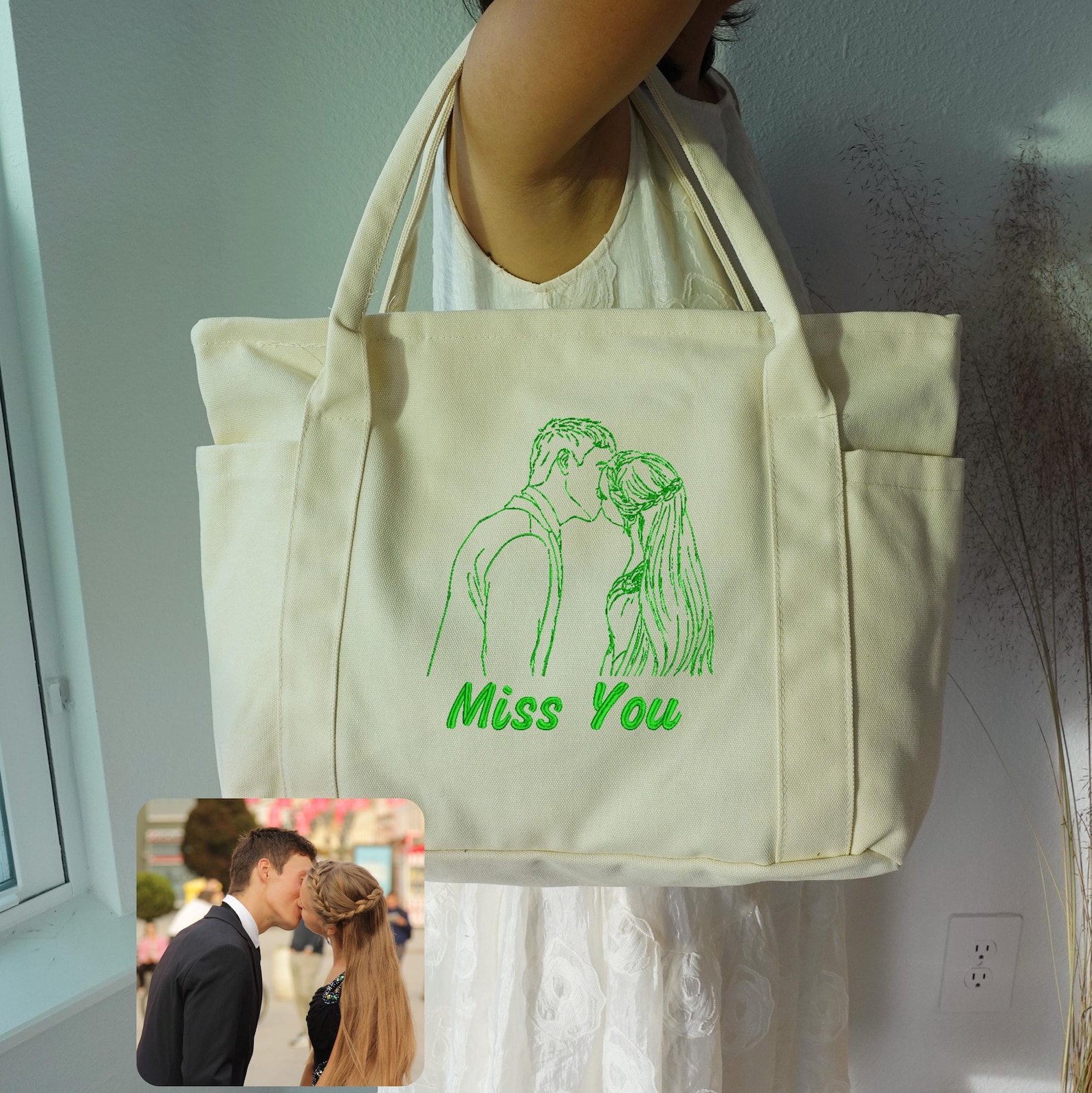 Custom Portraits: Our exquisite craftsmanship transforms your cherished photos into finely embroidered portraits, adding a unique touch to your tote bag.