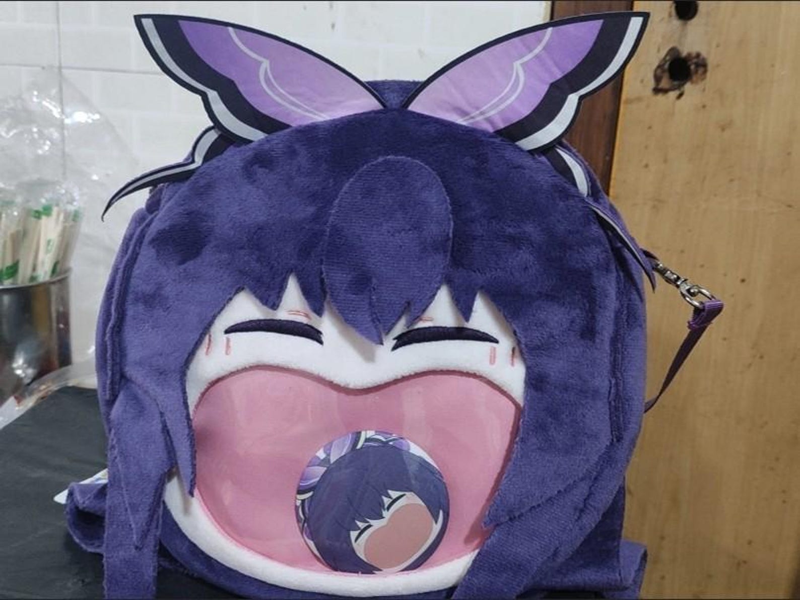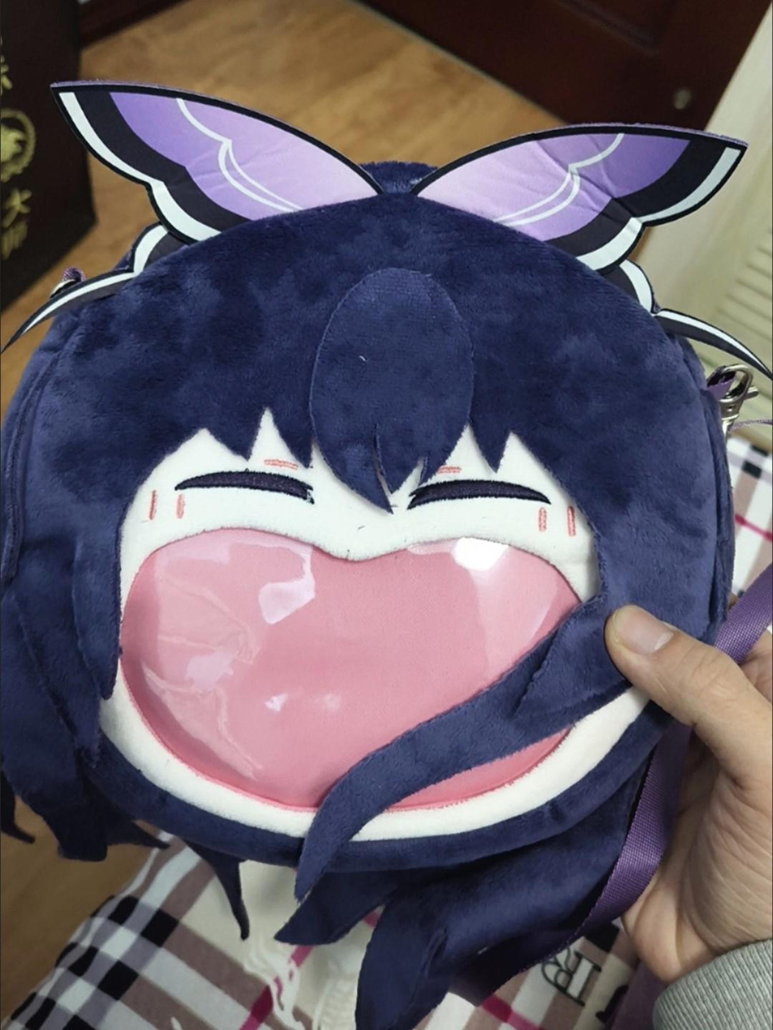 💜 Anime-Inspired Plush Design – Cute Date A Live Tohka Yatogami character bag with fluffy plush fabric, soft textures, and her signature purple ribbon and headpiece.