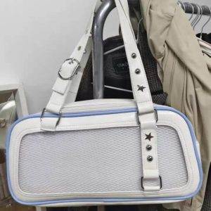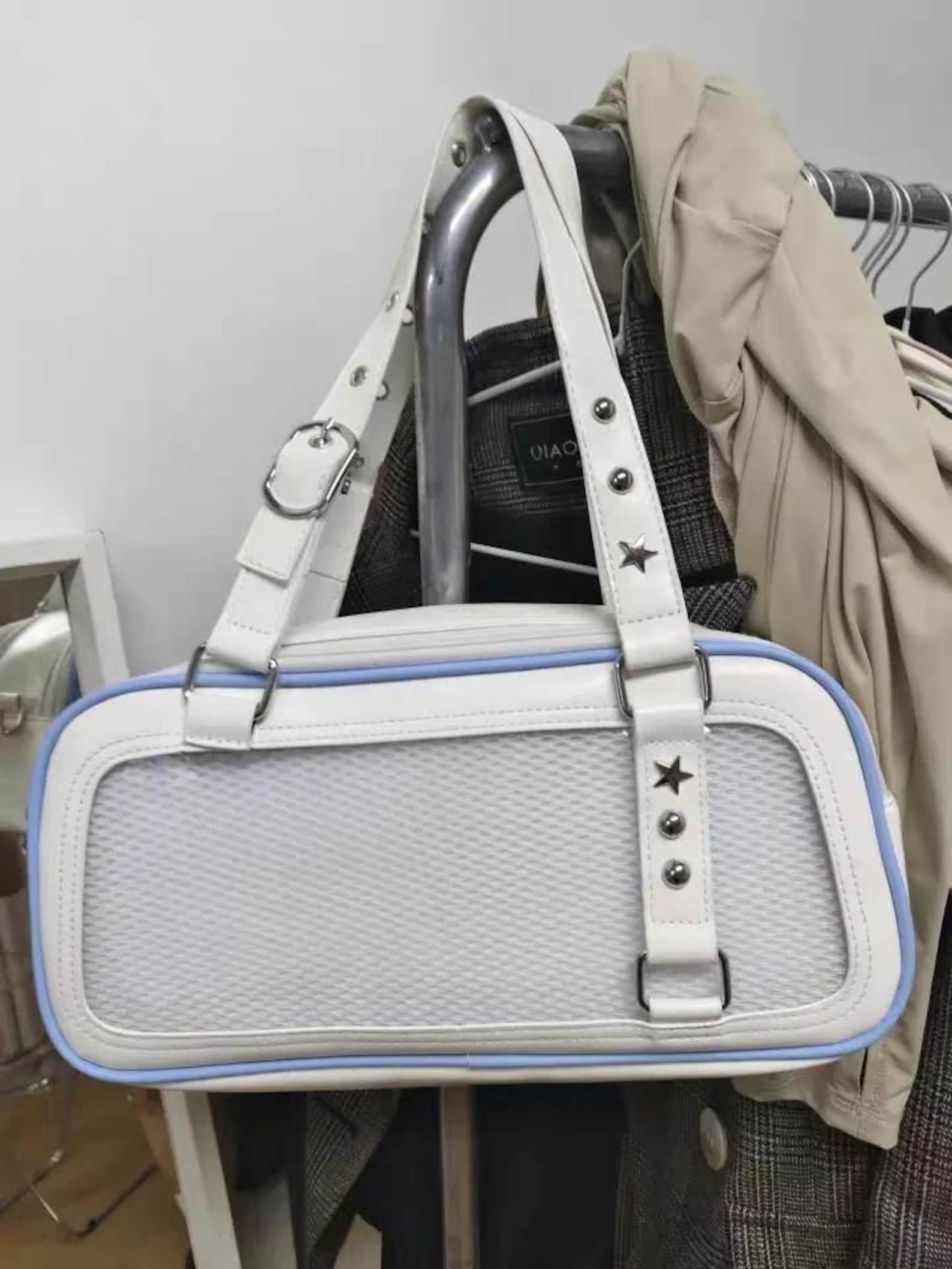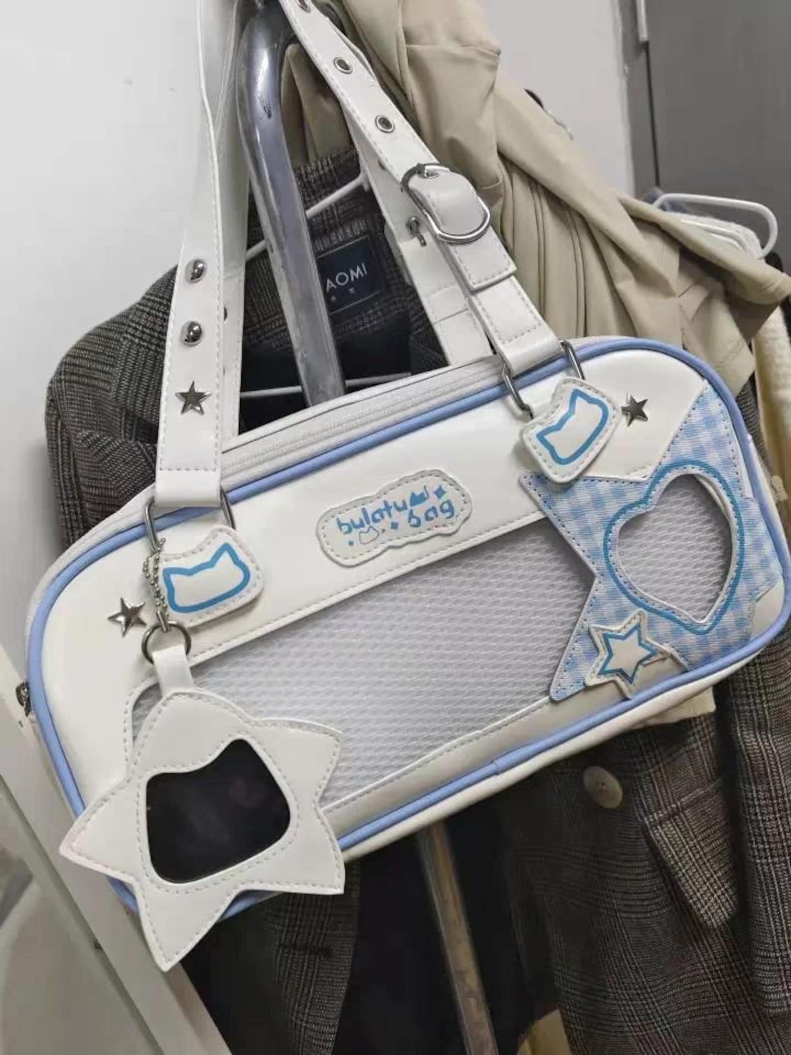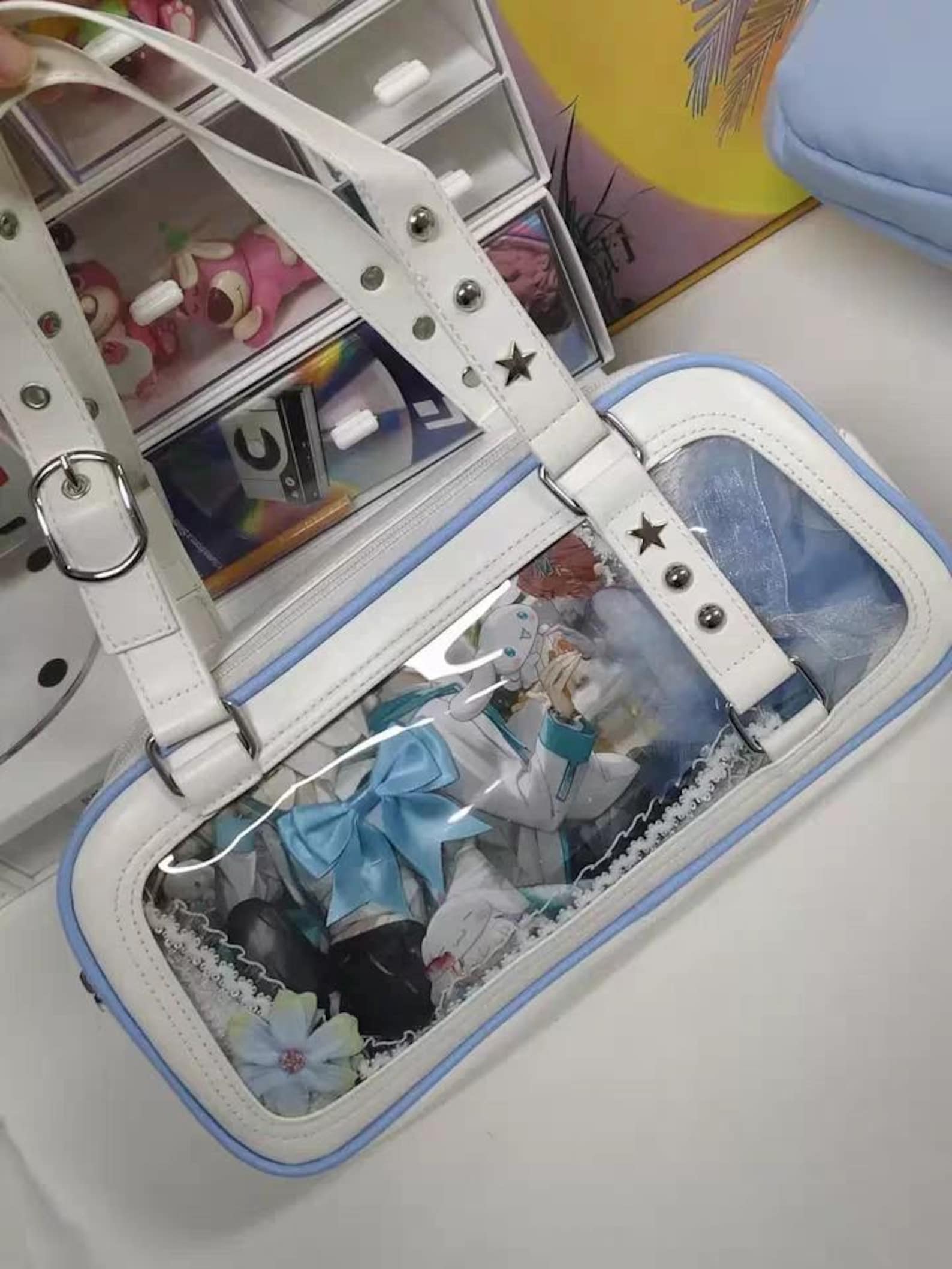 Double-Sided Ita Bag with Clear Window | Kawaii White Blue Anime Display Bag | Star Heart Cutout Shoulder Bag for Pins Charms