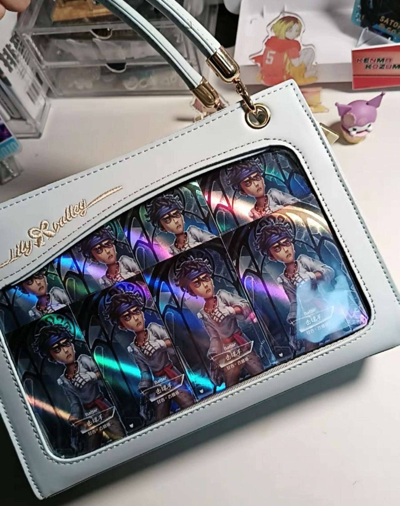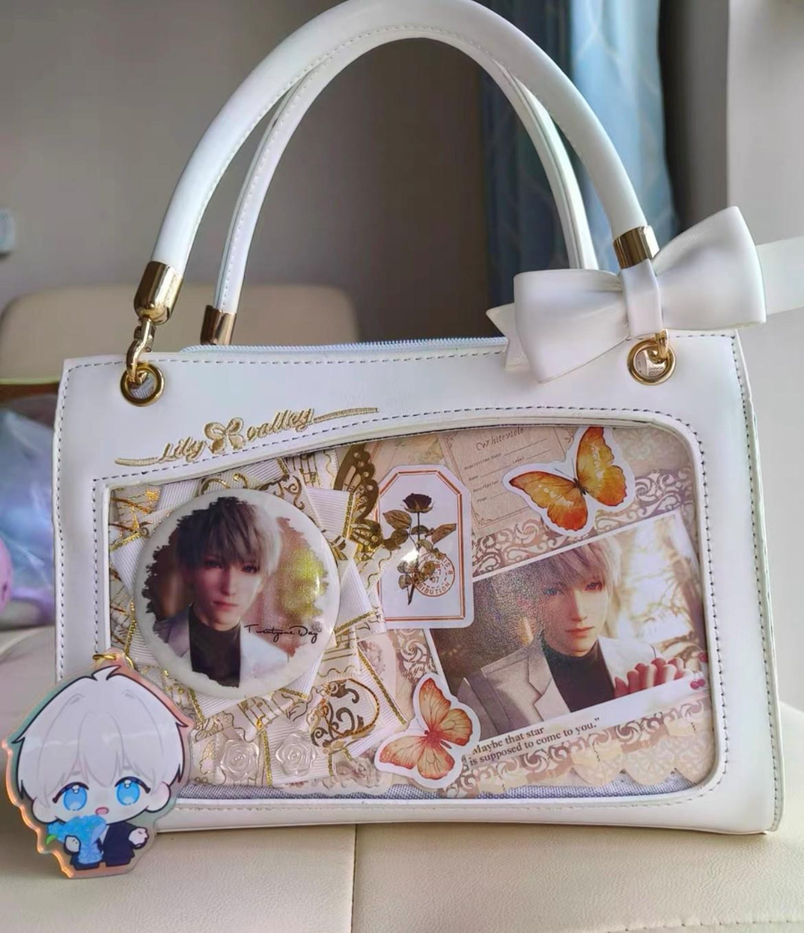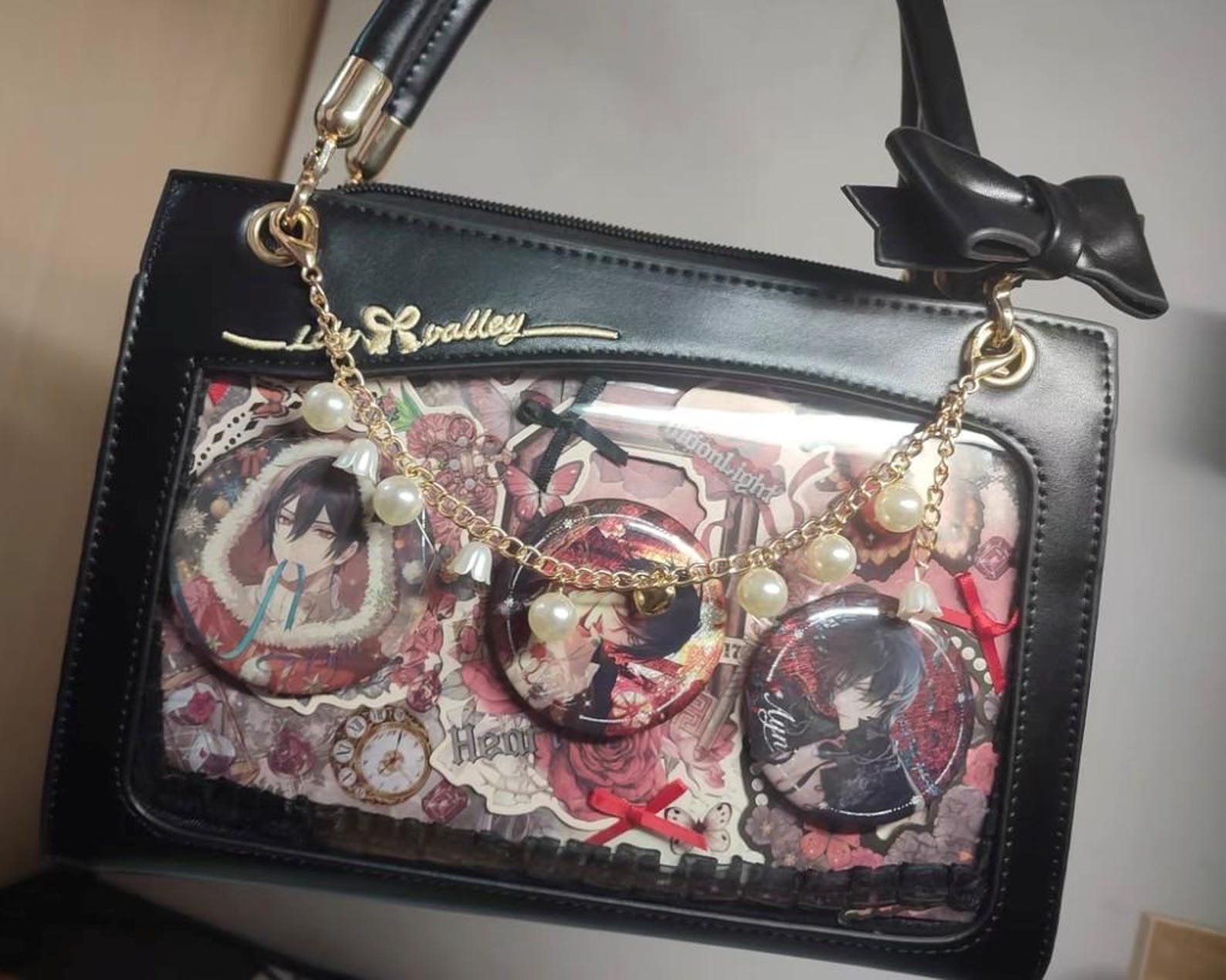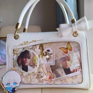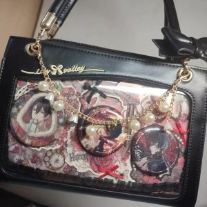 This elegant ita bag features a clear display window, perfect for showcasing your favorite anime pins, badges, keychains, postcards, plushies, or other collectibles. The stylish vintage and holographic designs cater to a wide range of aesthetics, from gothic lolita and punk rock to kawaii and soft pastel fashion.
