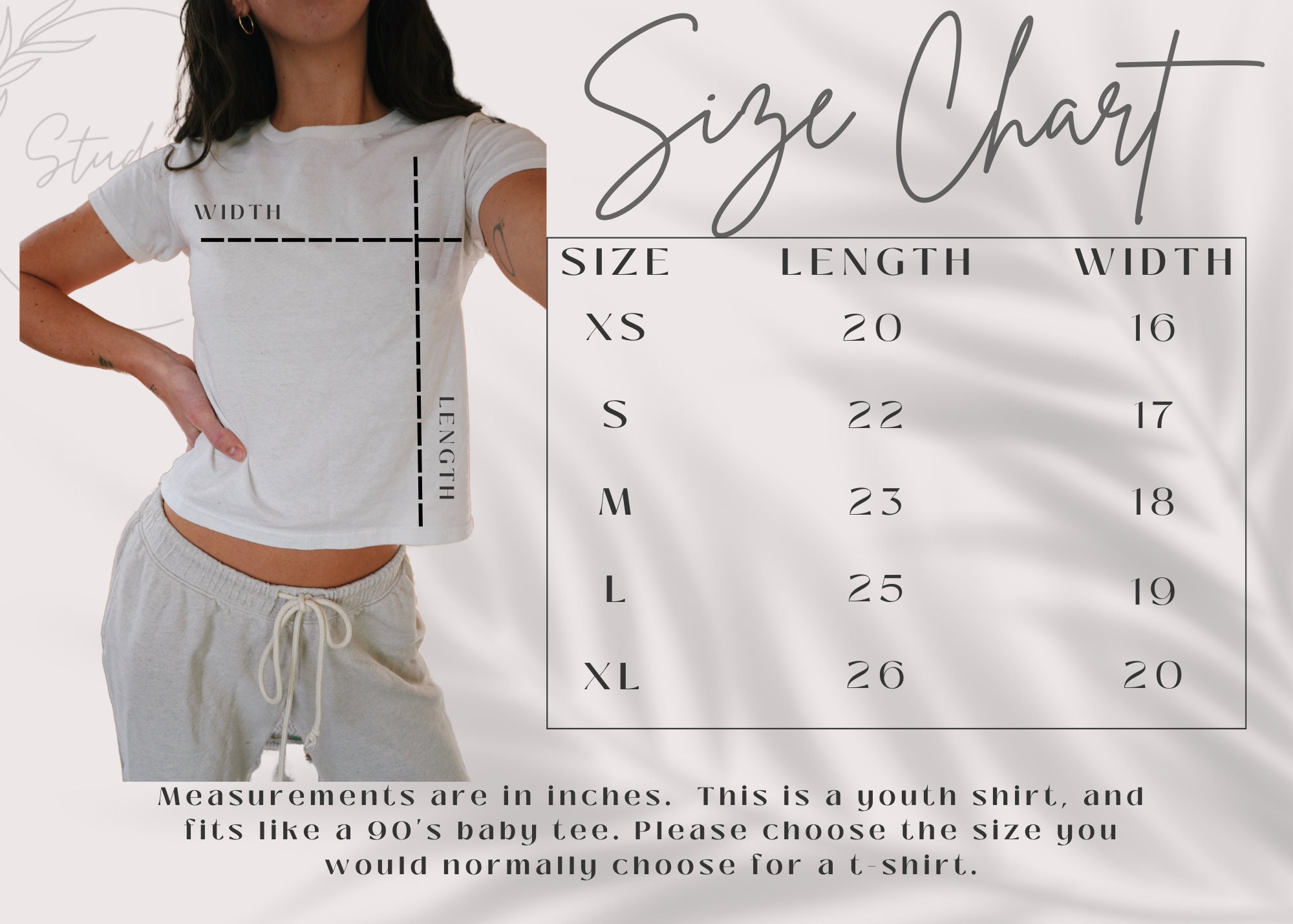 This is a youth t-shirt, and will fit like a 90's baby tee for adults. Please order the size you typically would as for a t-shirt. Sizing chart as above (last page).