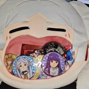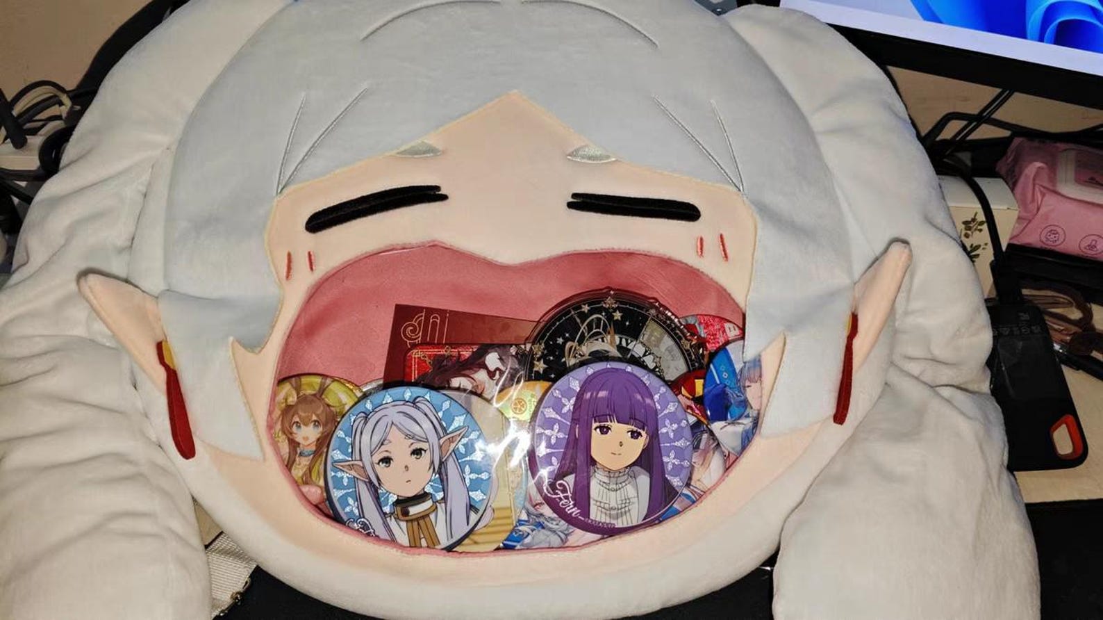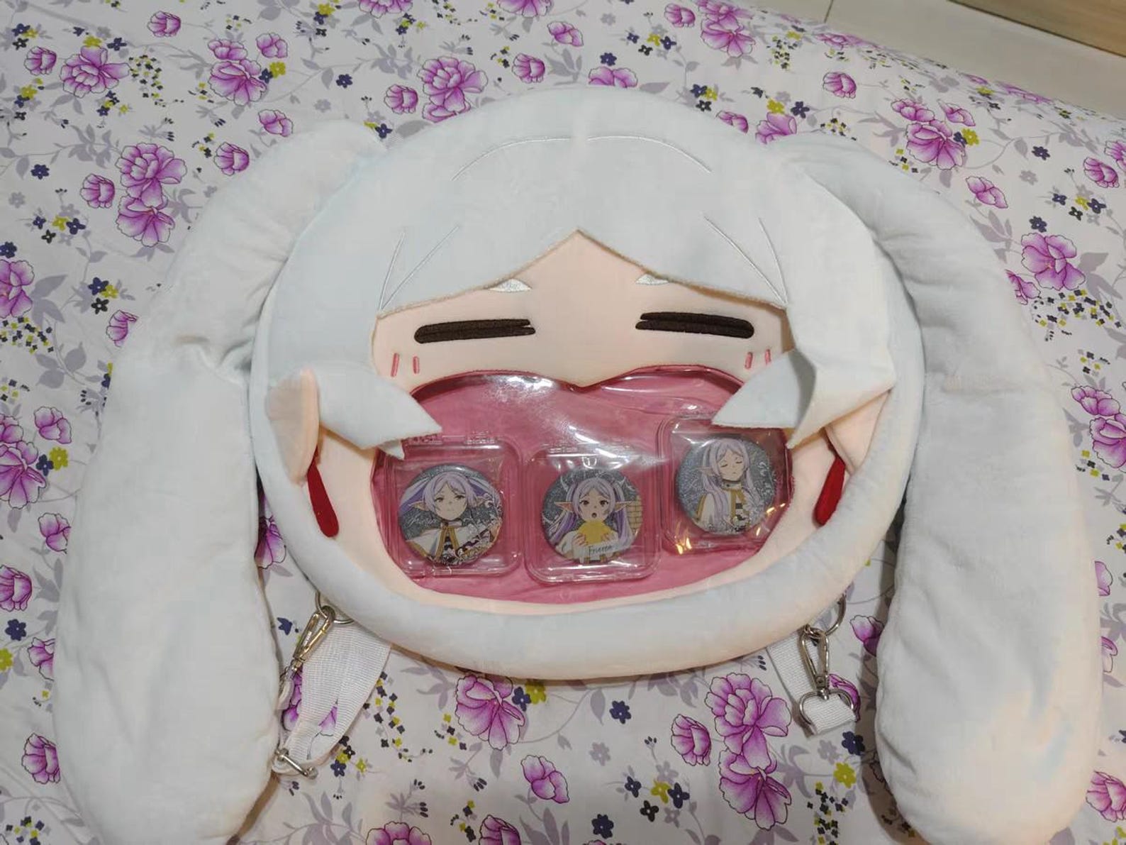 💖 Frieren-Inspired Ita Bag – Features the adorable face of Frieren with a wide pink display window, perfect for showcasing badges and merch.