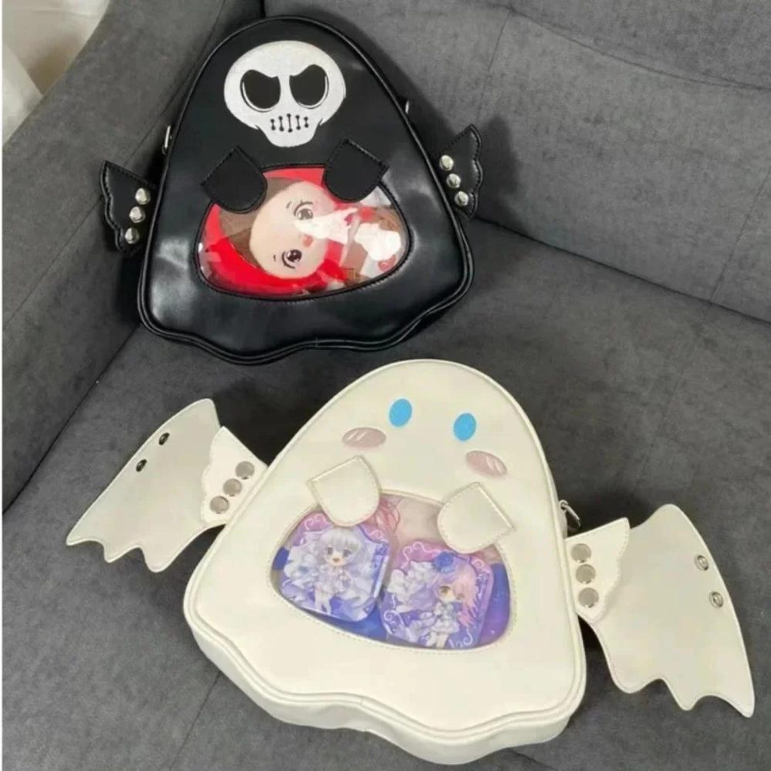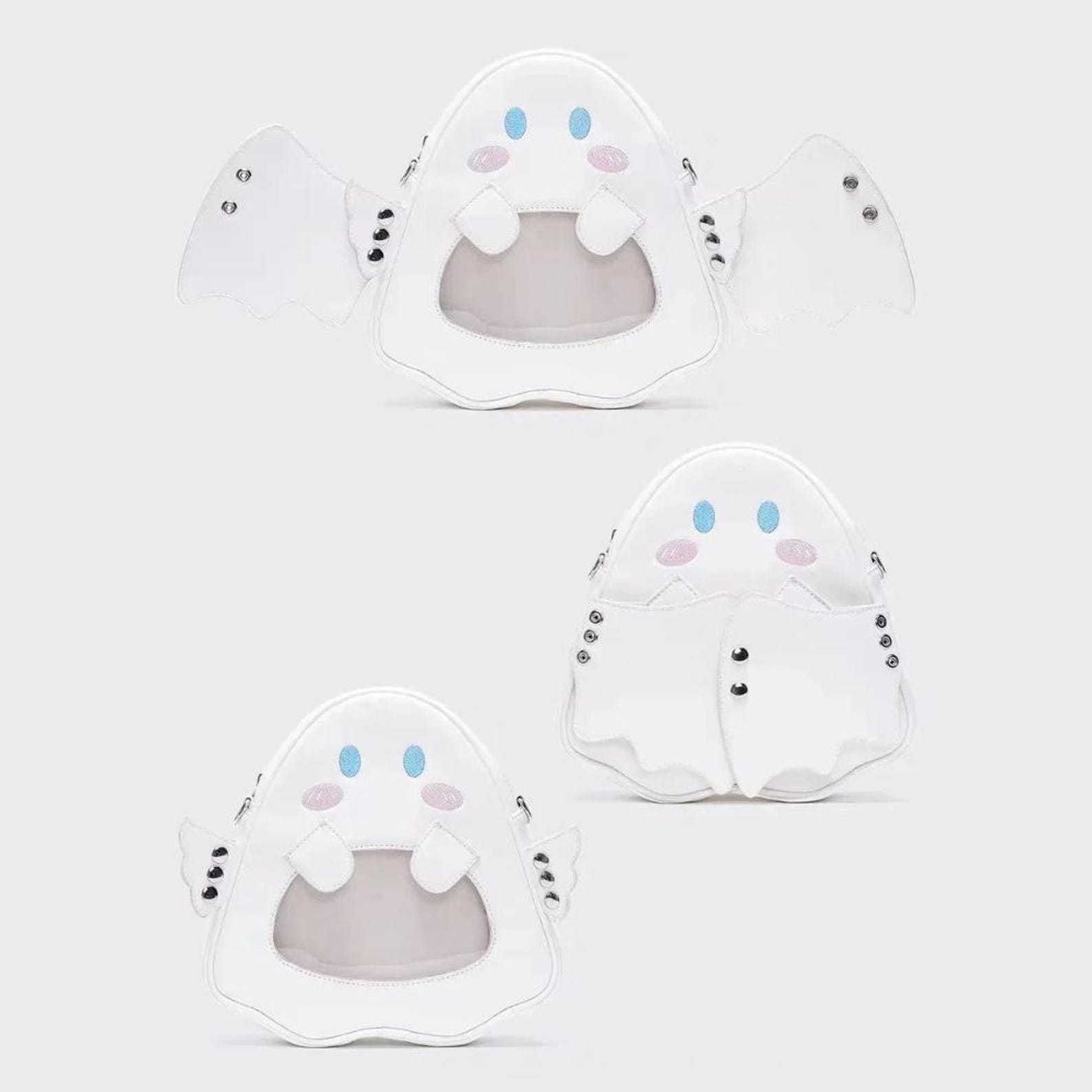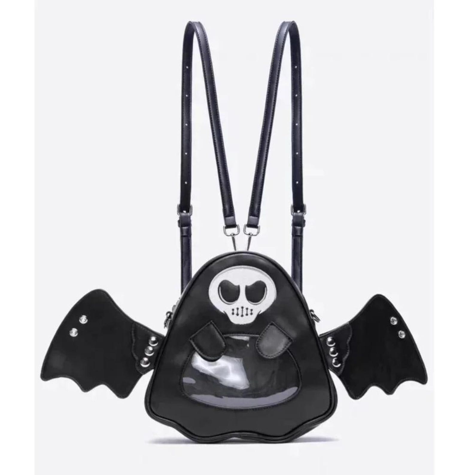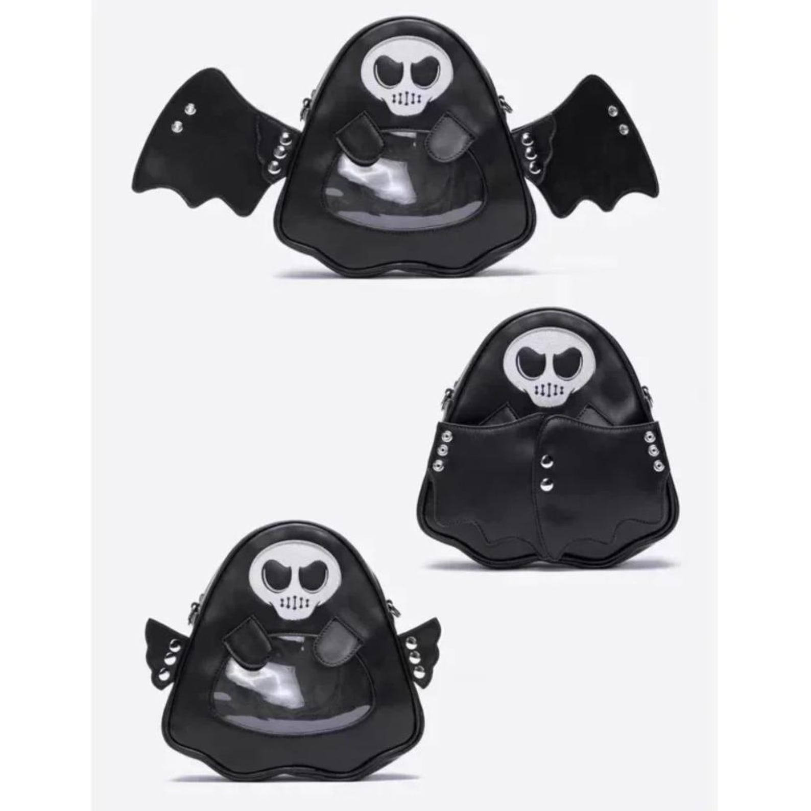 This Ghost Angel Devil Ita Backpack is a bold accessory for fans of gothic, punk, and Harajuku fashion. Designed with detachable angel & devil wings, a transparent display pocket, and foldable storage design, it’s perfect for showcasing pins, charms, or badges while carrying daily essentials.