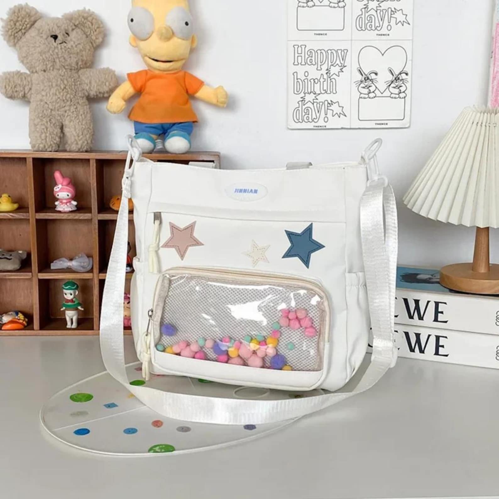 This Harajuku Ita Shoulder Bag is designed for women, students, and kawaii fashion lovers. Made from durable nylon, it features a transparent display pocket that lets you showcase your pins, charms, photo cards, or dolls, while still carrying all your daily essentials.