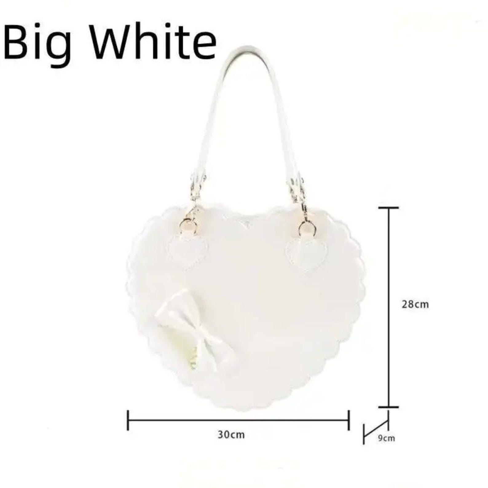This Heart Lolita Handbag is the perfect accessory for kawaii, Harajuku, and Lolita fashion lovers. Made from high-quality PU leather, it features a heart-shaped shell design, bowknot details, and comes in Pink, White, or Black.