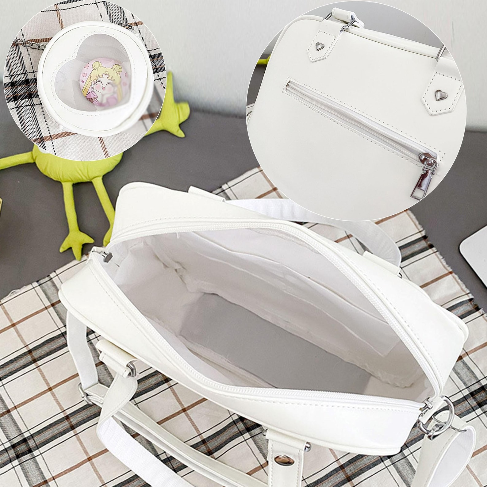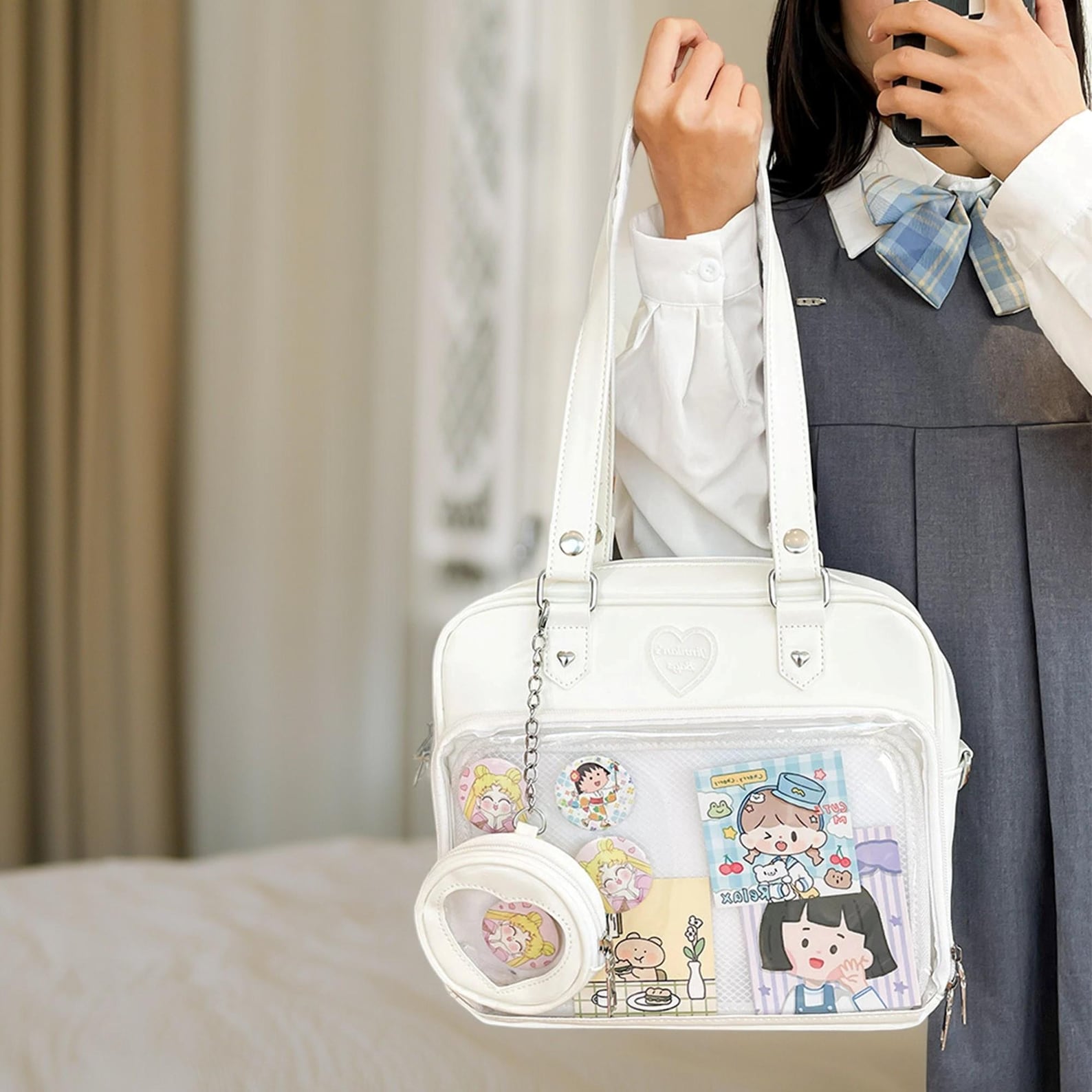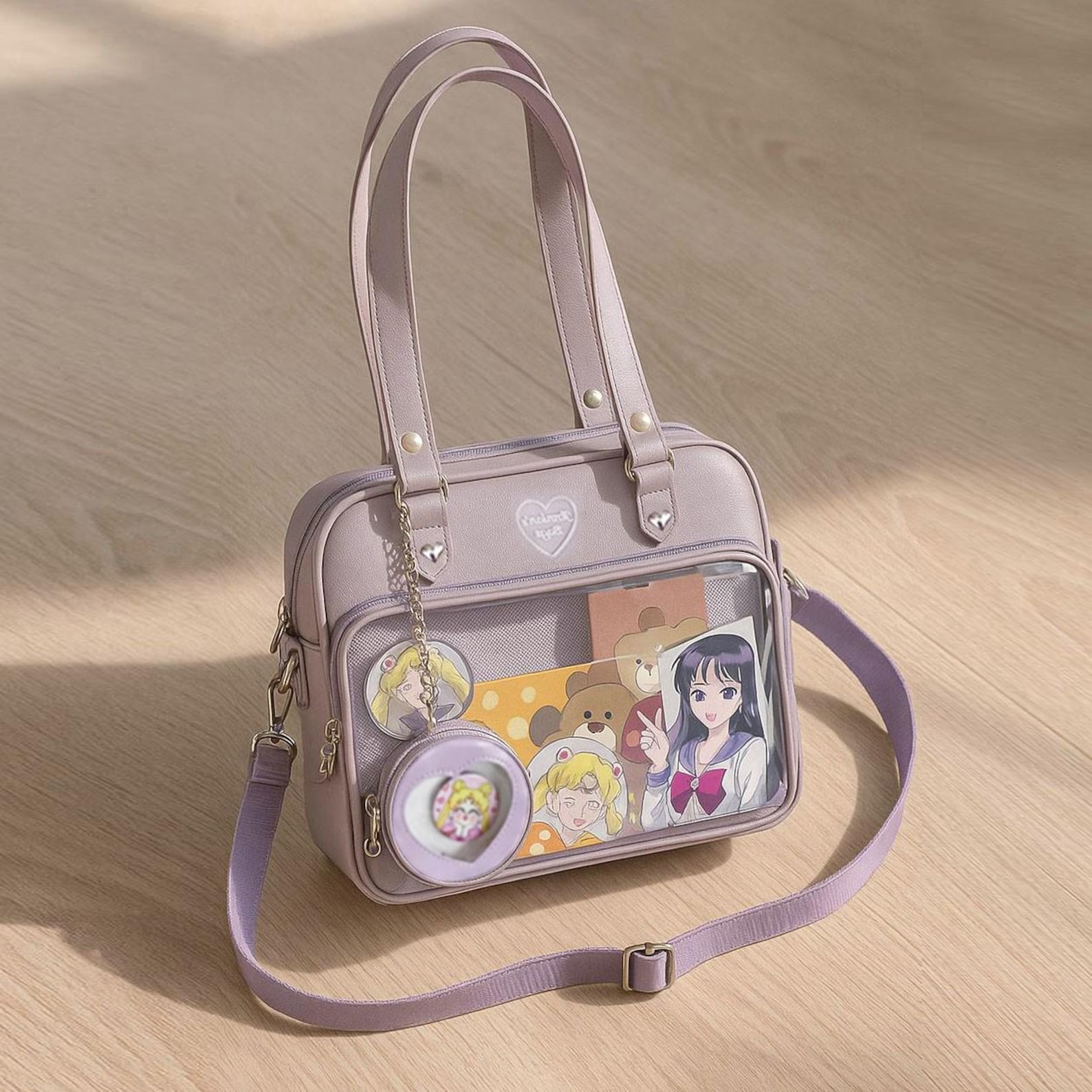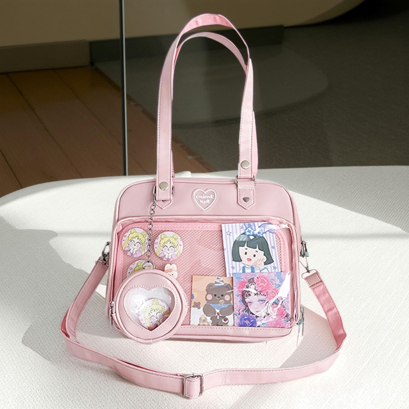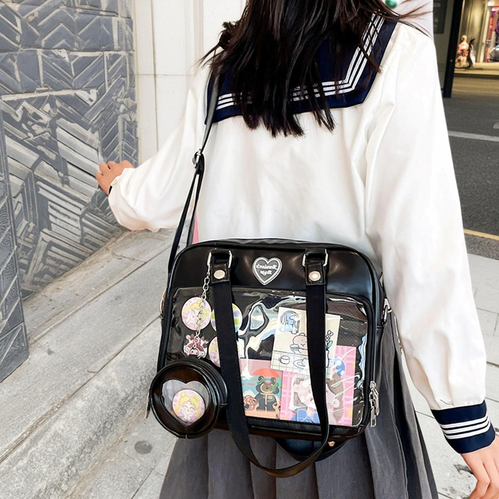 Design Highlights: Cute heart-shaped silhouette with a display window — perfect for anime lovers, students, or anyone who enjoys customizing their bag.