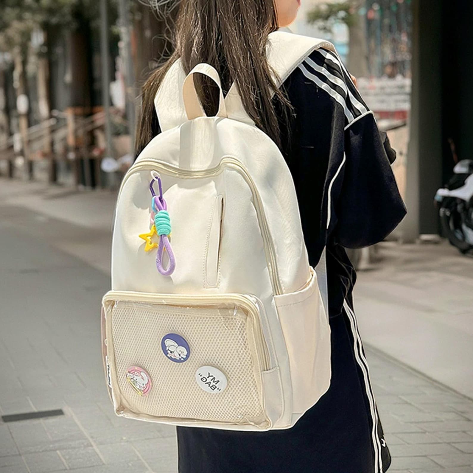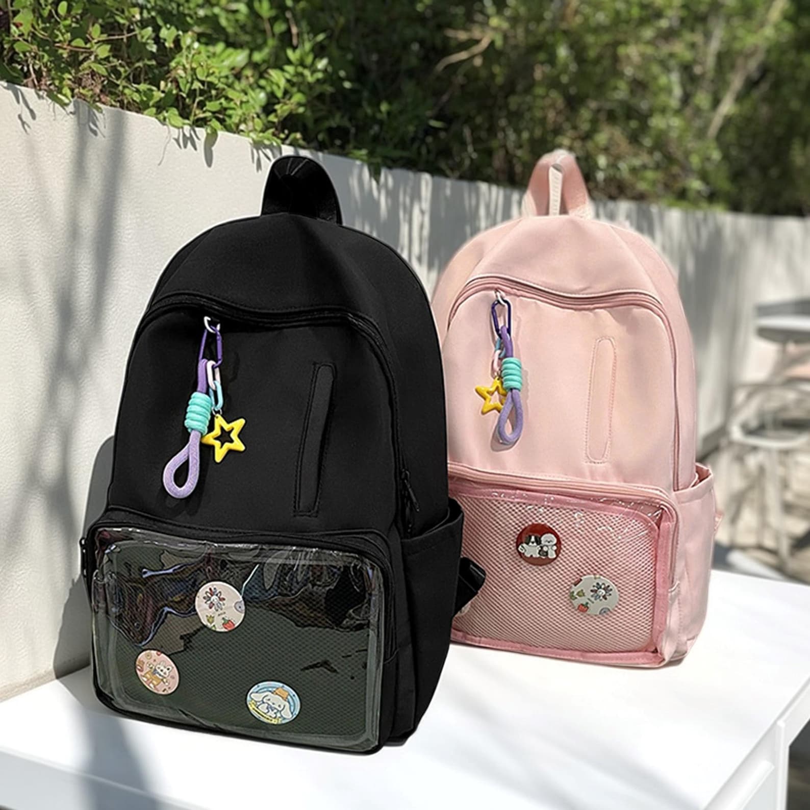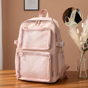 Show off your pins, keychains, and collectibles in style with this spacious Ita backpack. Designed with a clear front window, it’s perfect for customizing and displaying your favorite items while keeping them safe and organized. Made from durable nylon, this backpack is lightweight, functional, and fashionable—ideal for everyday use, conventions, or casual outings.