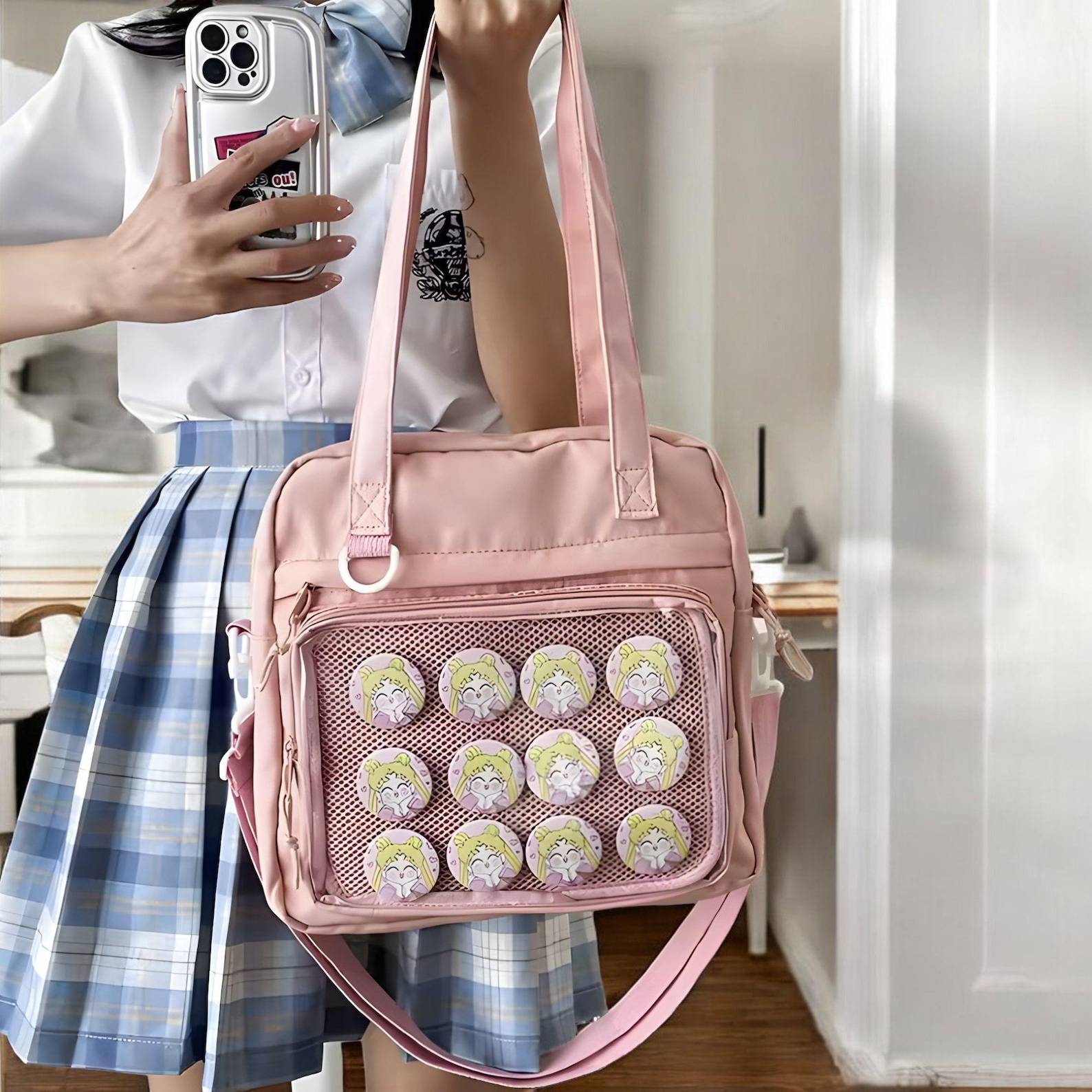 Pins, keychains, or other decorations shown in the photos are for demonstration purposes only and are not included with the bag.