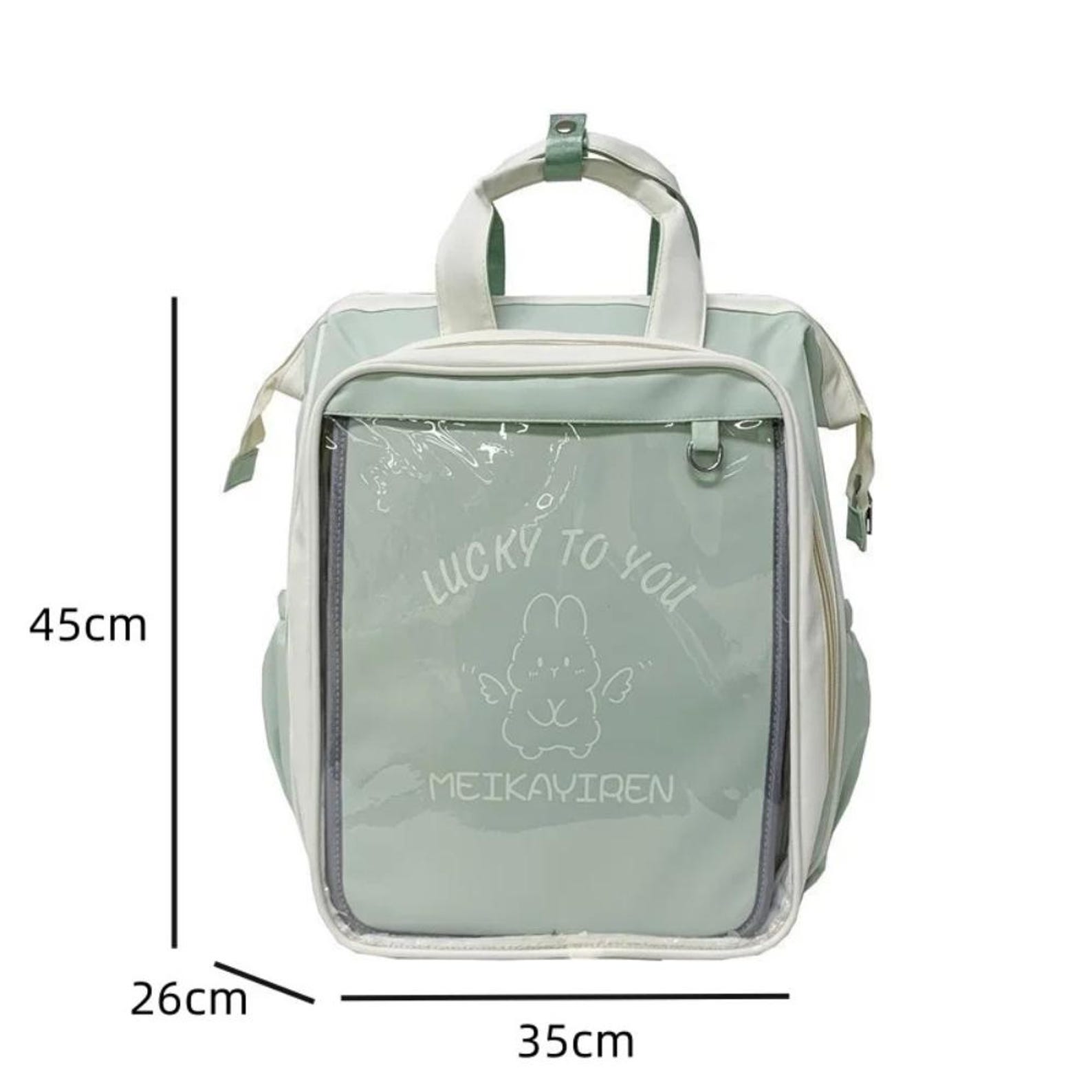 This Japanese Ita Backpack is designed for women, students, and kawaii lovers who want both functionality and fashion. Made from durable canvas, it features a transparent display window — perfect for showcasing your pins, charms, dolls, or photo cards while carrying your school books and daily essentials.
