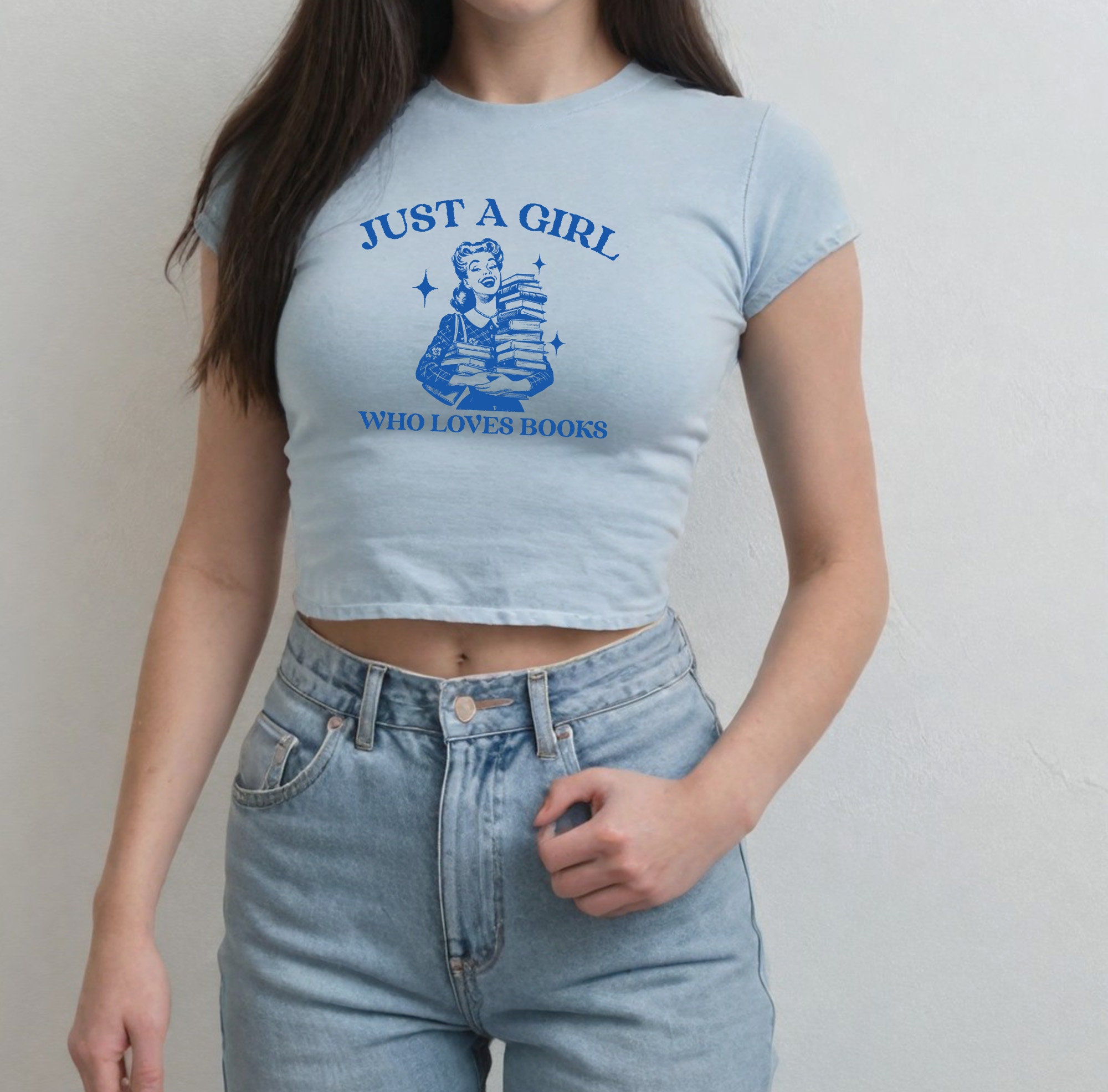 Just A Girl Who Loves Books Baby Tee Book Lover Graphic T, 90s T Shirt Reading Girly y2k baby tee 90s baby tee y2k Crop