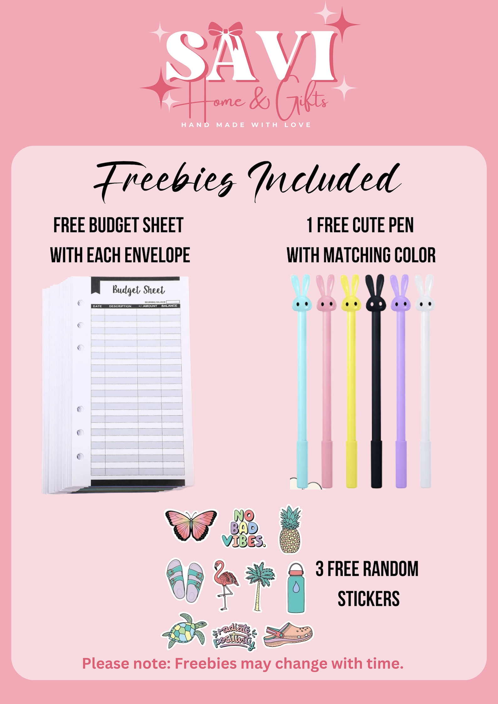 -Freebies: 3 random free stickers, 1 cute pen, and a budget sheet for each cash envelope.