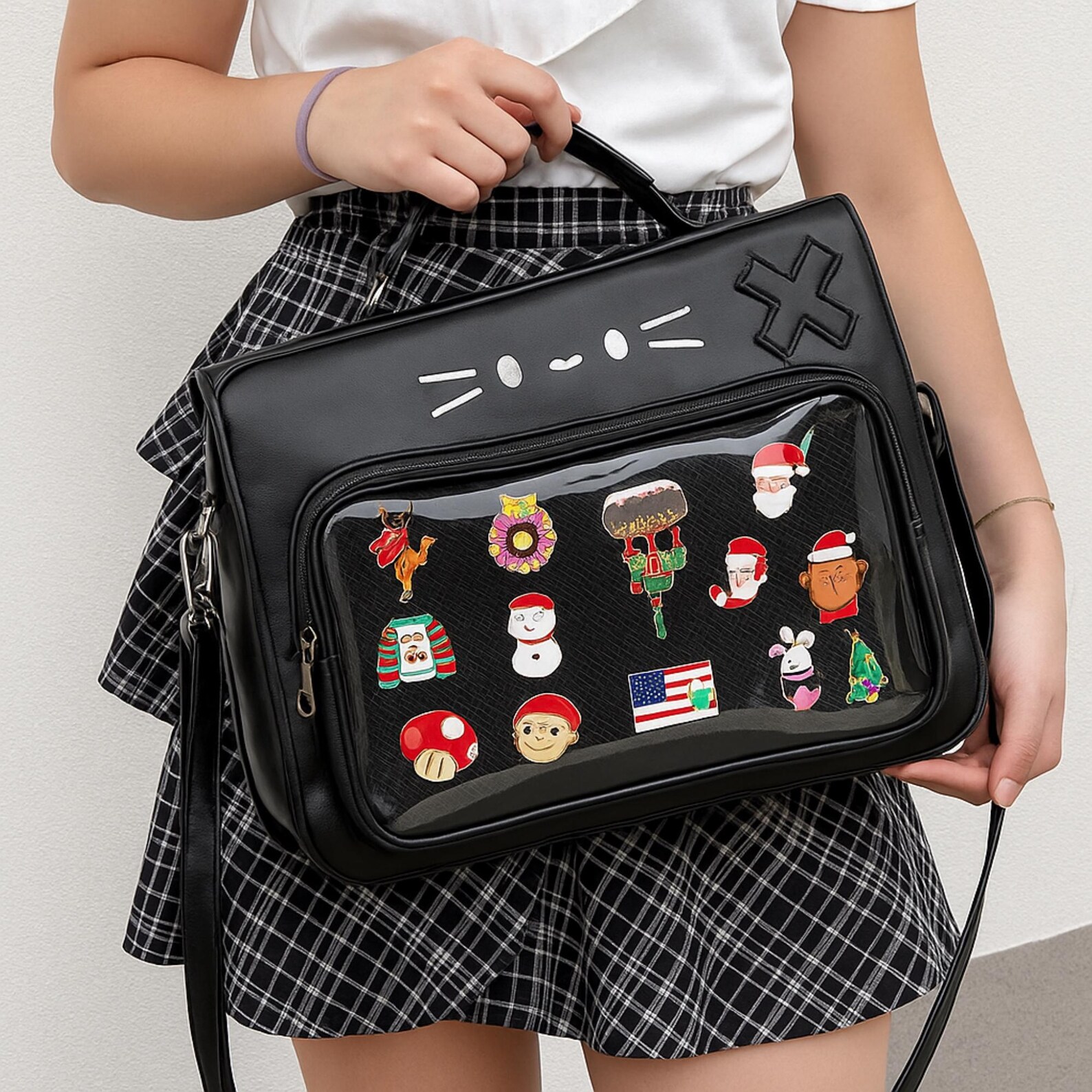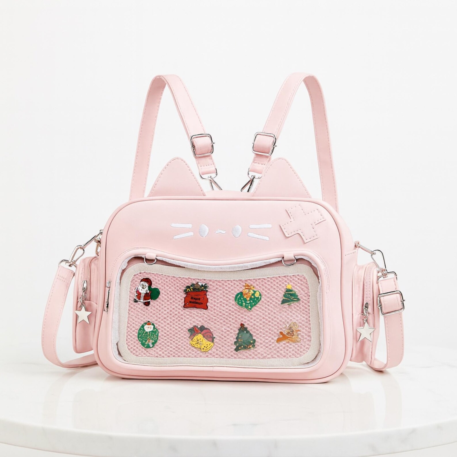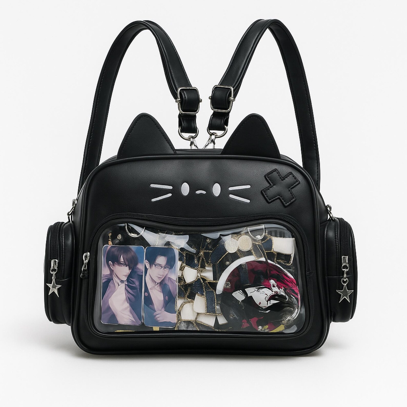 Made with durable faux leather and detailed with cute star charms, embroidered cat features, and side pockets, this multi-purpose bag is ideal for anime fans, cosplayers, gamers, K-pop lovers, and collectors.