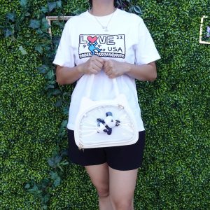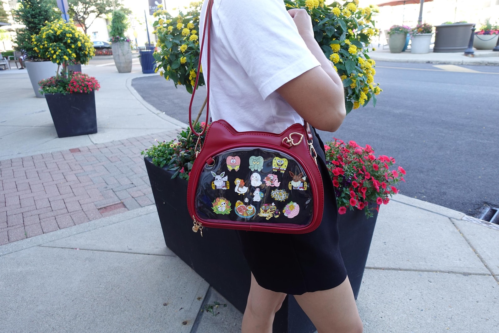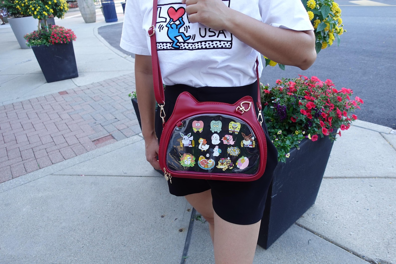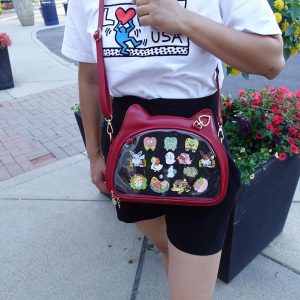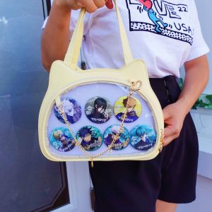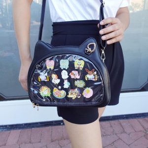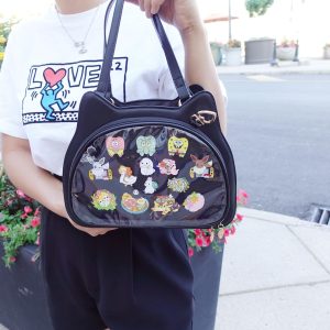 This kawaii bag is designed with a transparent display window, perfect for showcasing your favorite enamel pins, keychains, badges, or plush charms.