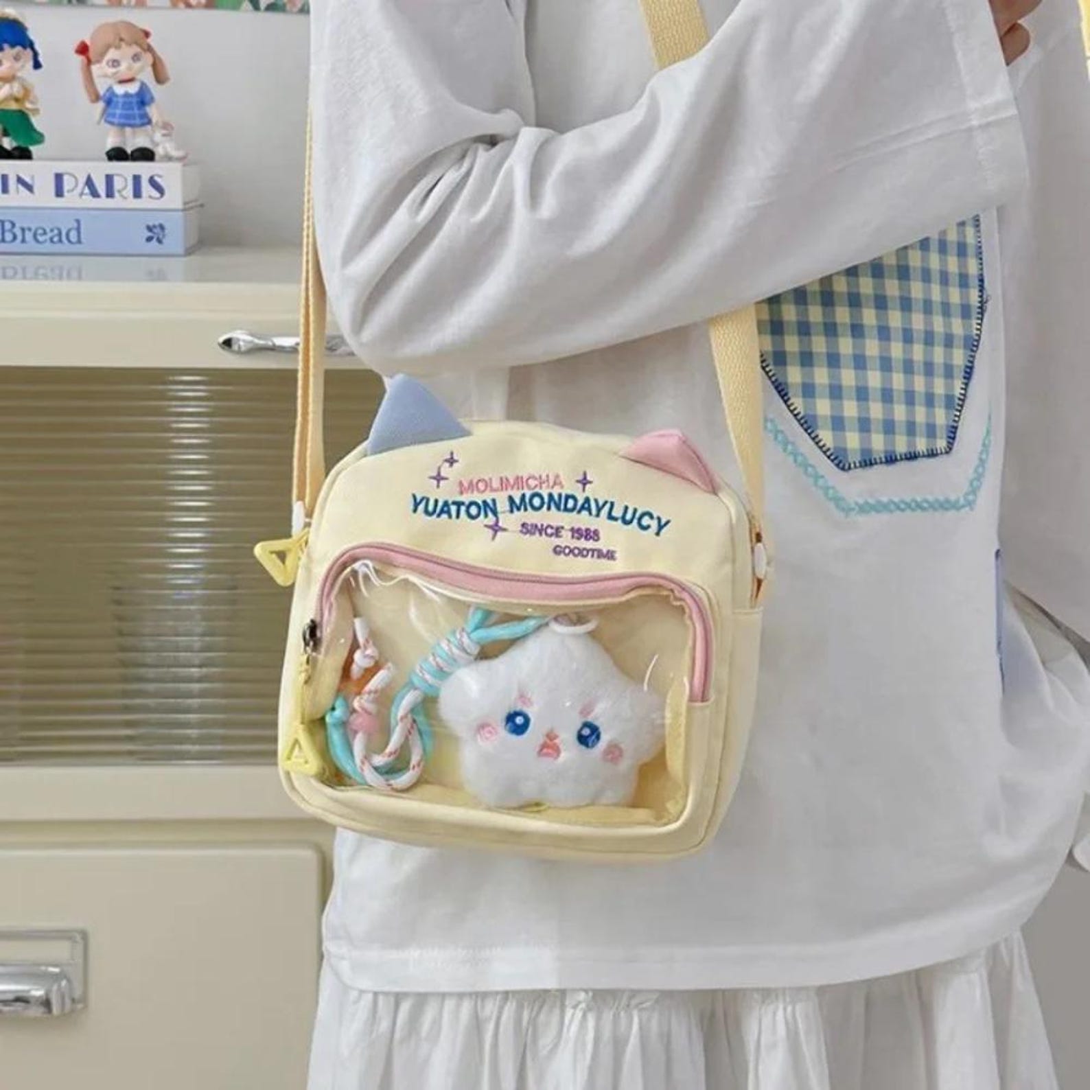 Add a burst of dopamine style to your outfit with this Kawaii Cat Mini Ita Bag, designed for cute fashion lovers who enjoy functional, lightweight accessories. Made from durable nylon, this compact mini shoulder bag features an embroidered cat letter patch and a transparent ita window perfect for displaying charms, keychains, or mini dolls.