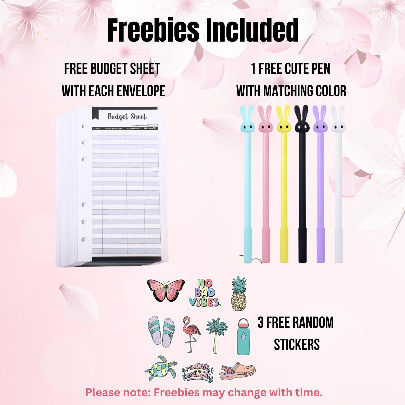 -Freebies: 3 random free stickers, 1 cute pen, and a budget sheet for each cash envelope.