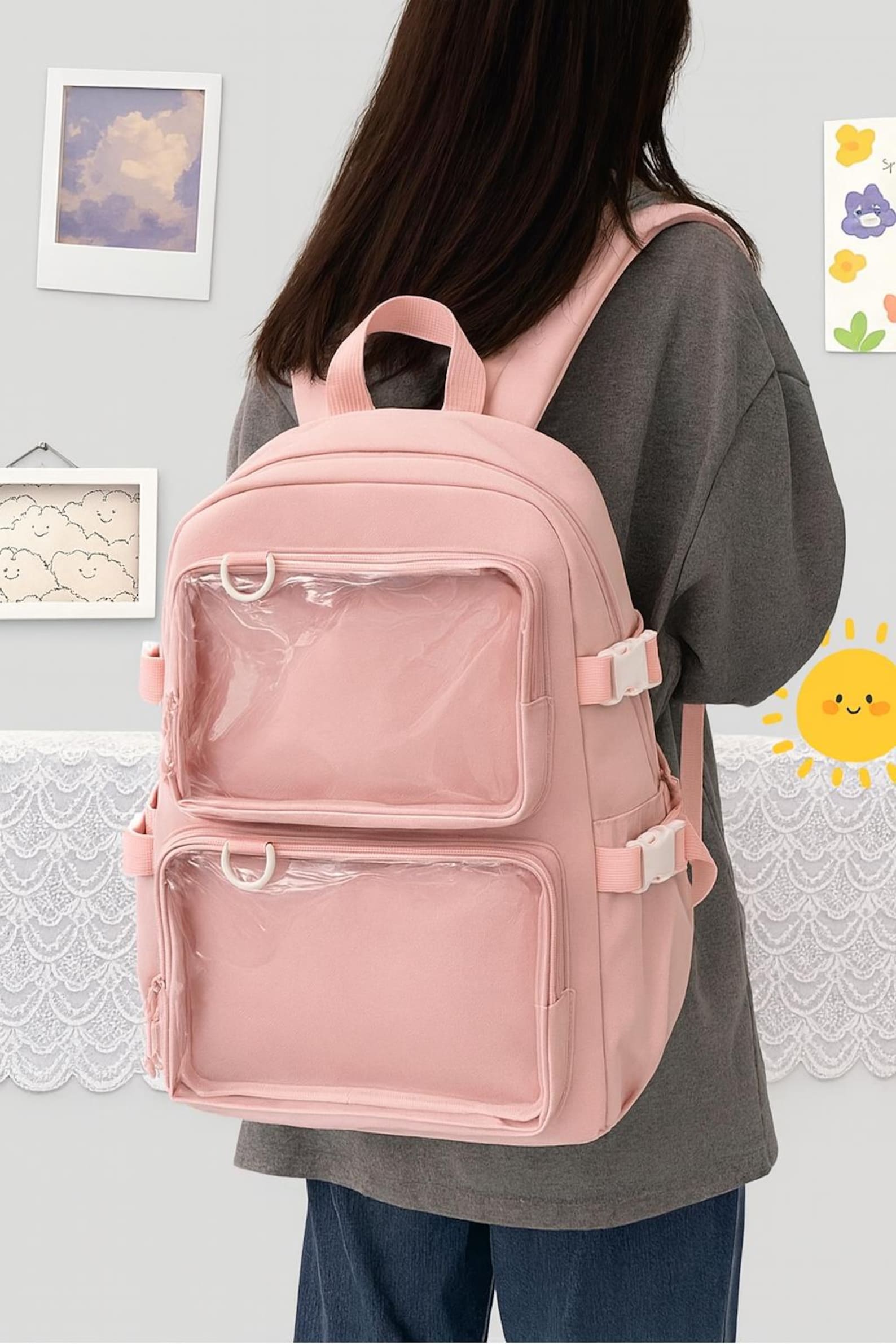 Add a touch of cuteness and creativity to your daily routine with this adorable Japanese-style ita backpack! Perfect for anime fans, students, or anyone who loves the kawaii aesthetic, this transparent ita bag lets you showcase your favorite keychains, plushies, pins, or photocards while keeping all your essentials organized.