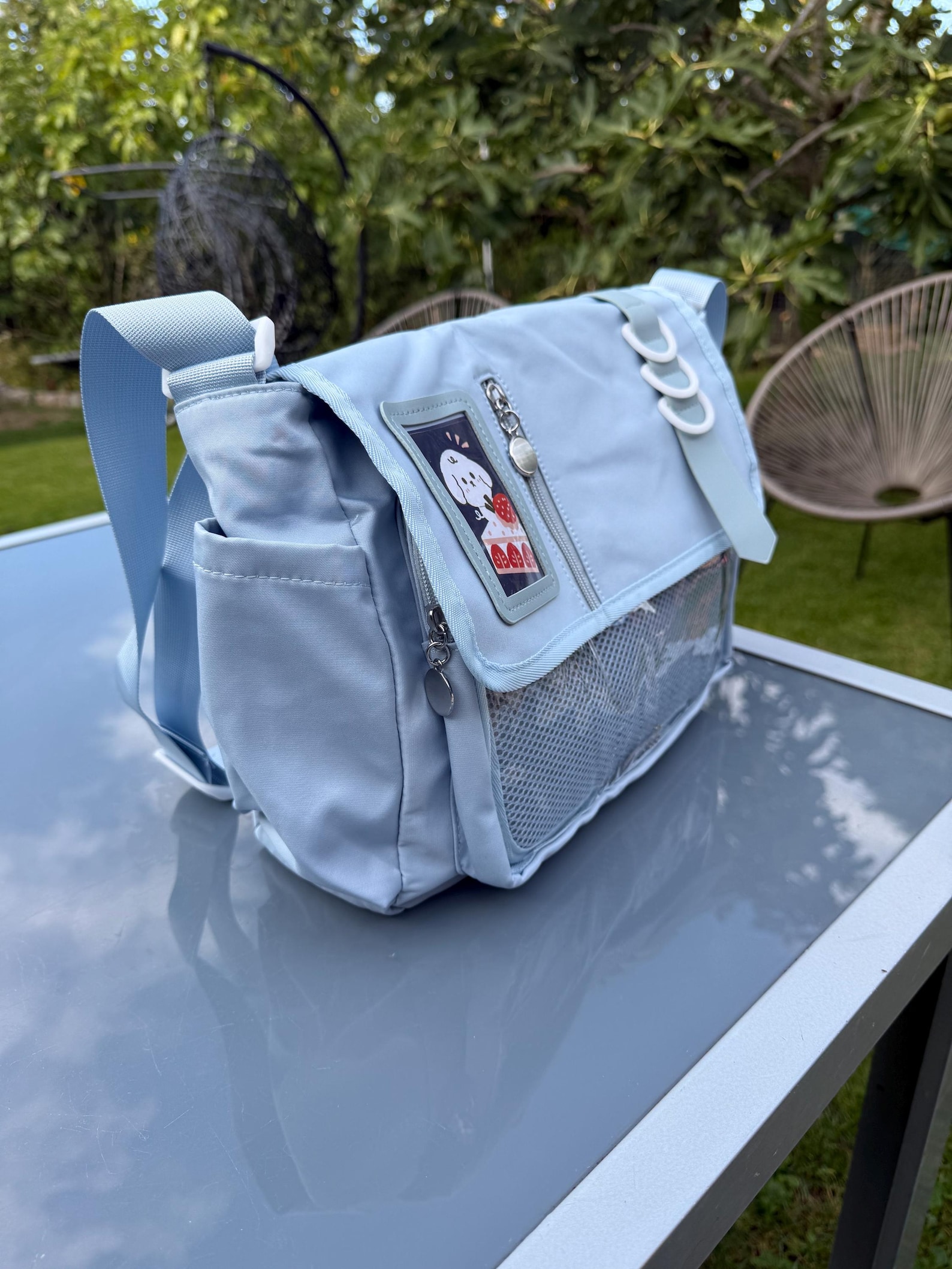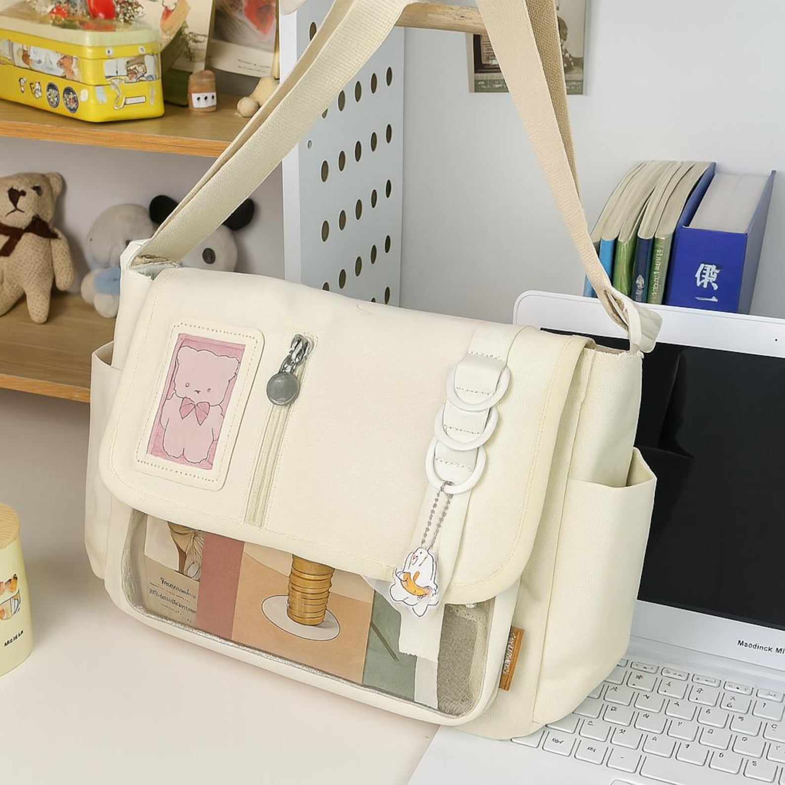 Show off your kawaii style with this large transparent ita bag inspired by Harajuku and Y2K fashion. Designed to display your enamel pins, badges, plushies and photo cards, it combines style and practicality for everyday use.