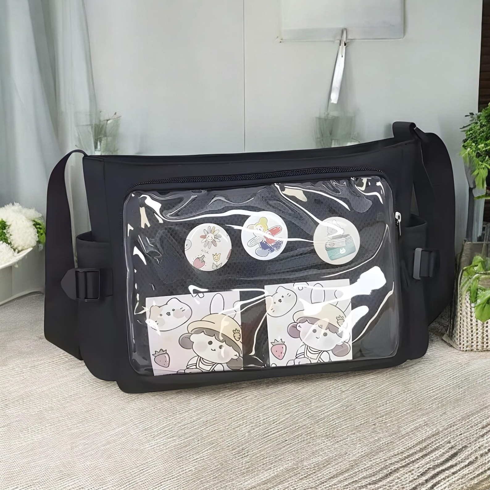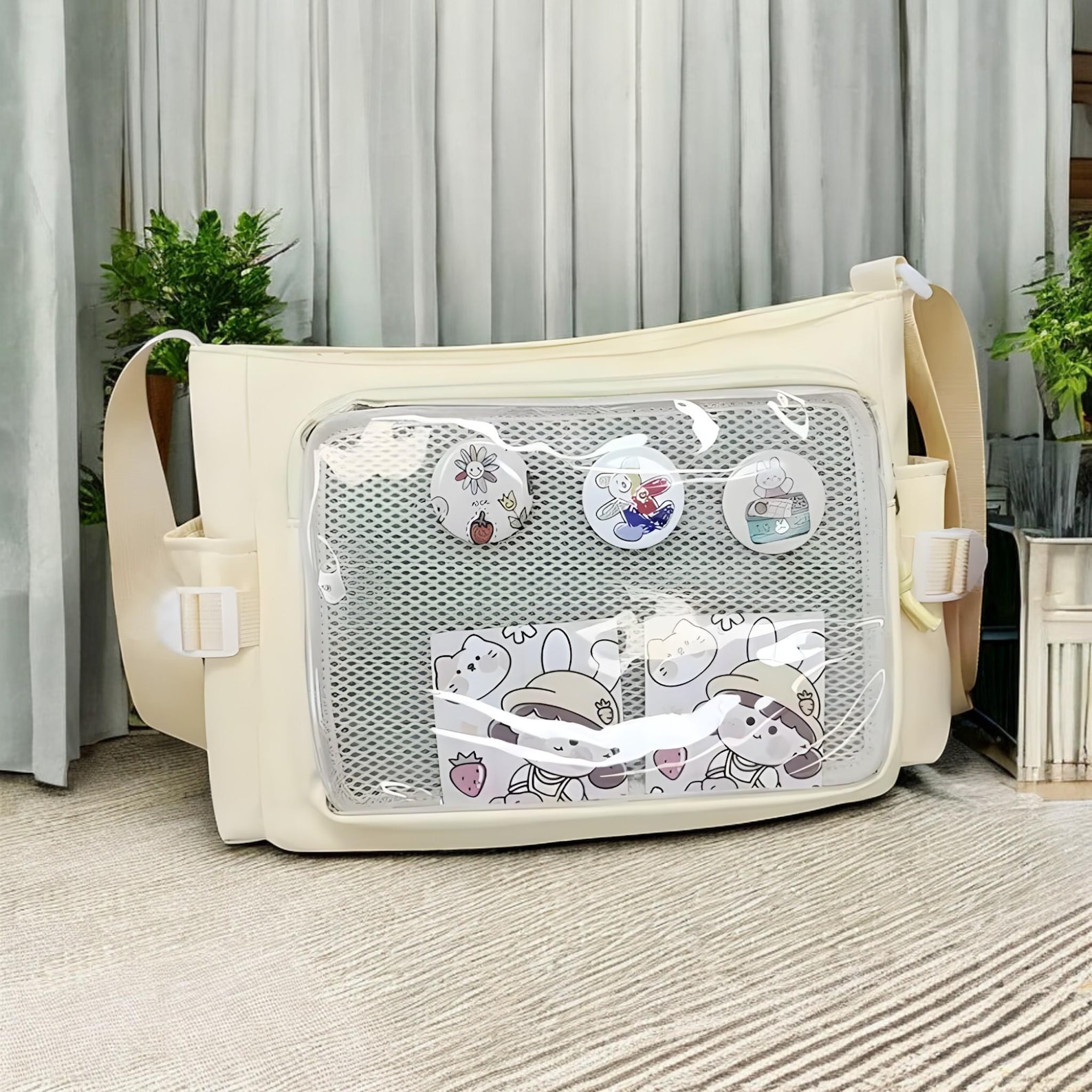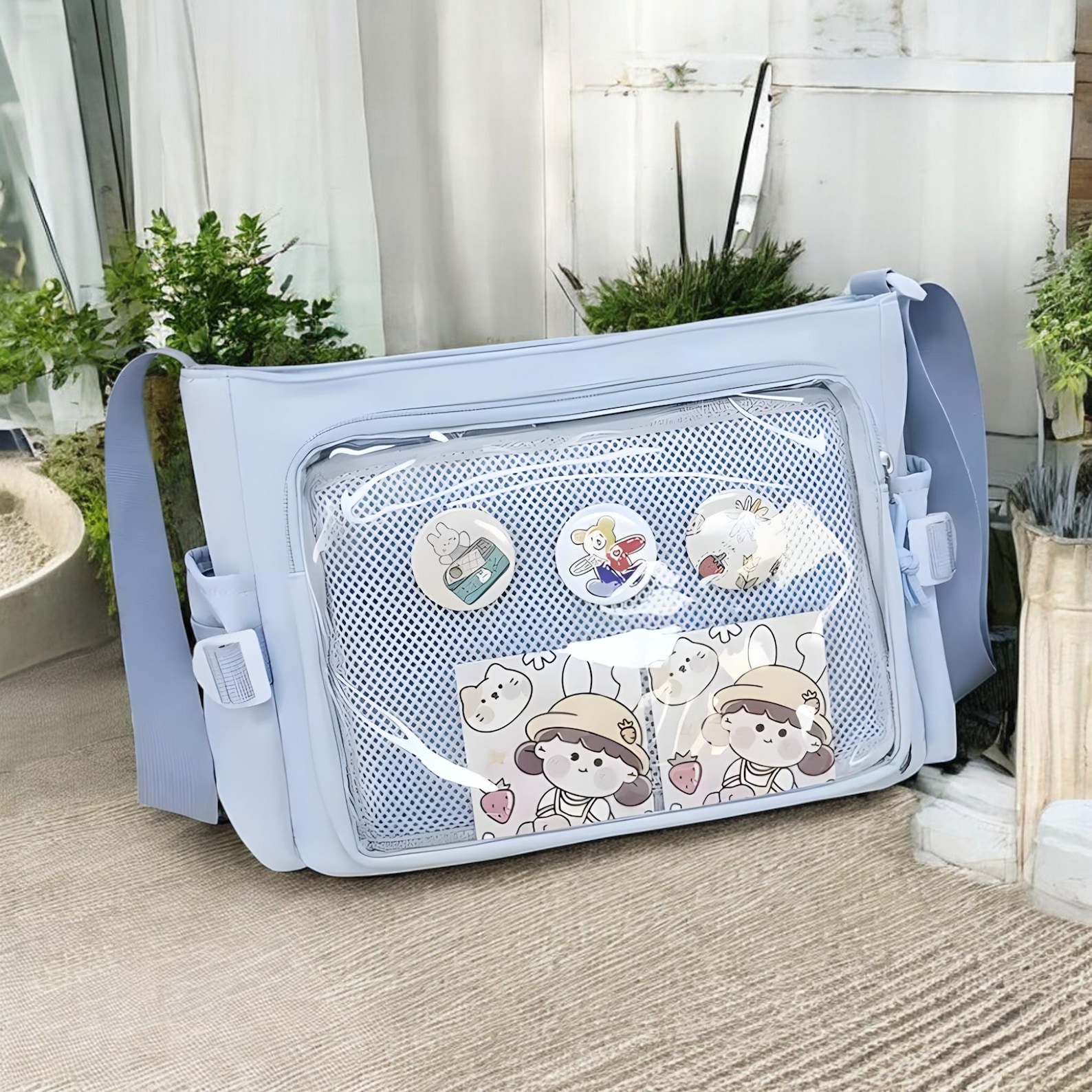 Carry your essentials in style with this charming pastel shoulder bag! Its standout feature is the clear window pocket, designed for you to display your favorite pins, badges, stickers, or even photos. Whether you’re heading to school, hanging out with friends, or attending your next anime convention, this bag is the perfect mix of practicality and cuteness. 🌸