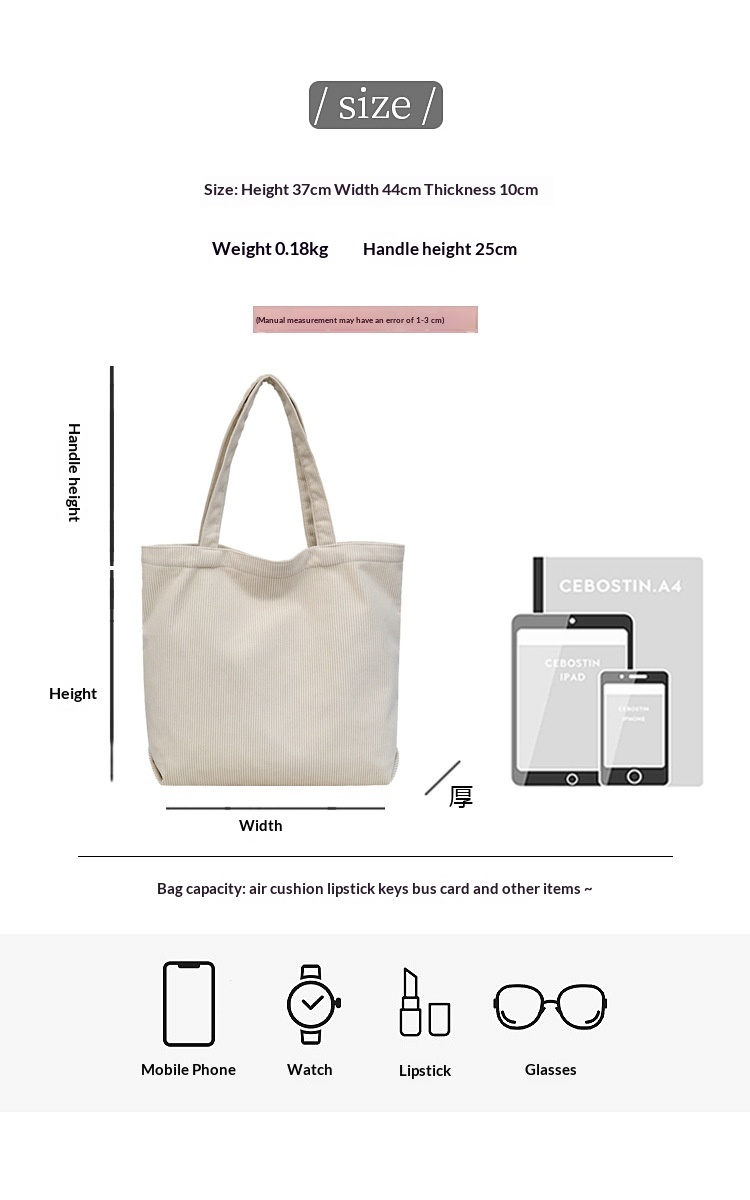 Surprisingly well-made for the price— the soft, breathable fabric that doesn’t cling, Small touch, big difference. Glad I picked Large-Capacity Corduroy Tote Bag Simple And Stylish Shoulder up.