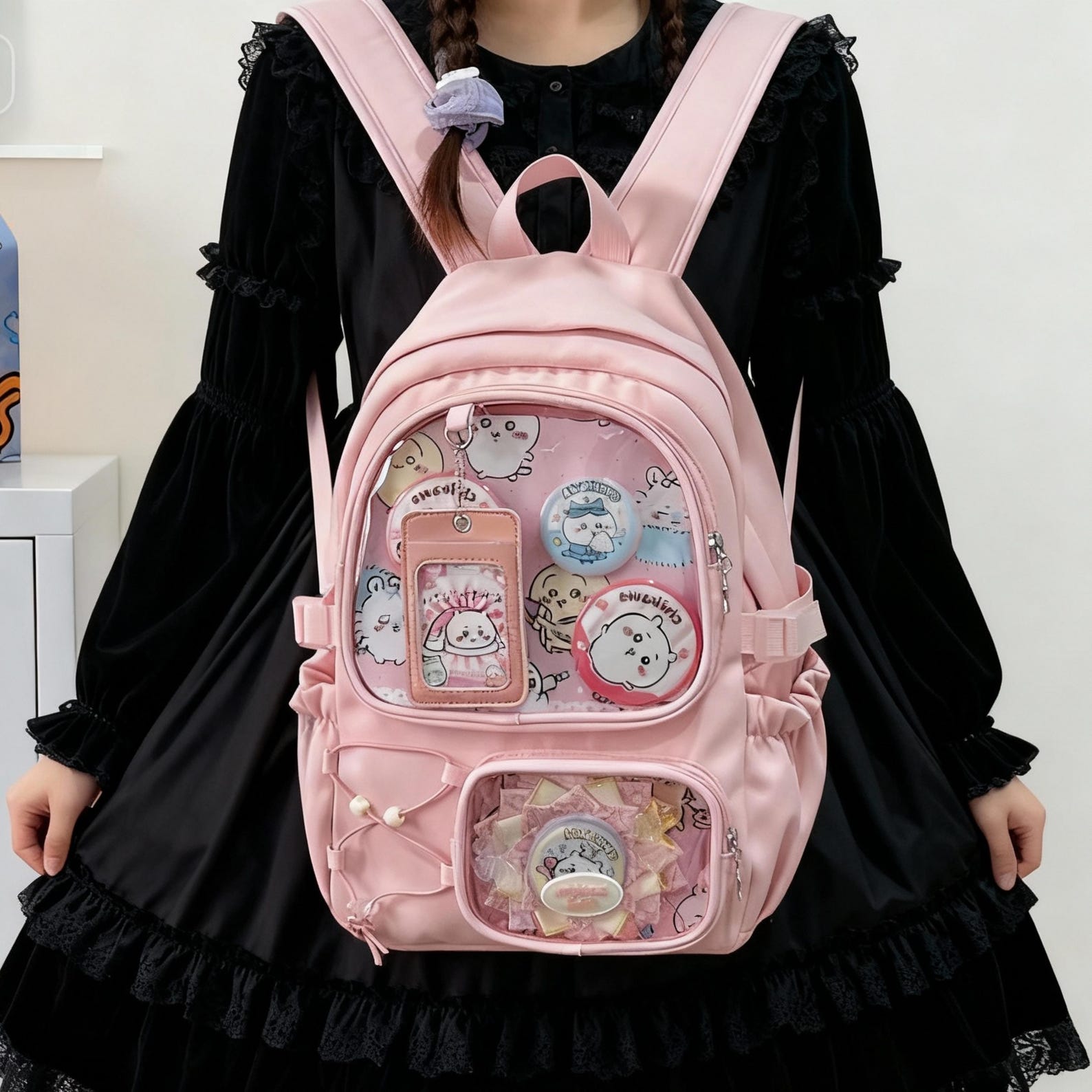 Take your pins, charms, and collectibles everywhere with this adorable Ita Backpack! Featuring 2 clear display pocket with a cute card holder which can show off your favorite picture. this backpack is perfect for anime fans, pin collectors, and lovers of kawaii style. Its large size makes it practical for school, conventions, or everyday use while letting you show off your favorite merch safely.