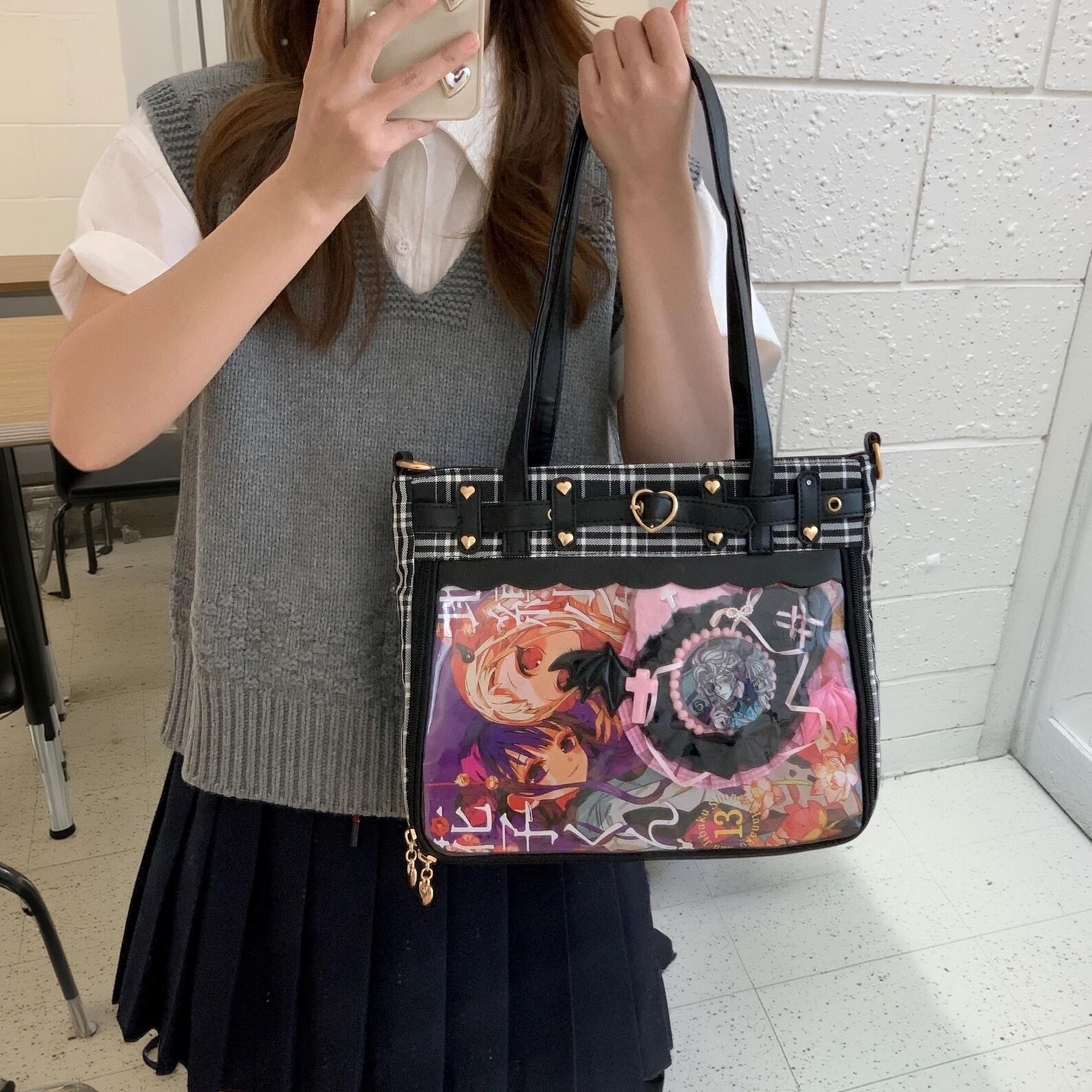 Show off your favorite pins, charms, and plushies with this stylish and durable PU Ita Bag. Featuring a clear front window, this bag is perfect for anime lovers and collectors who want to display their fandom with pride.