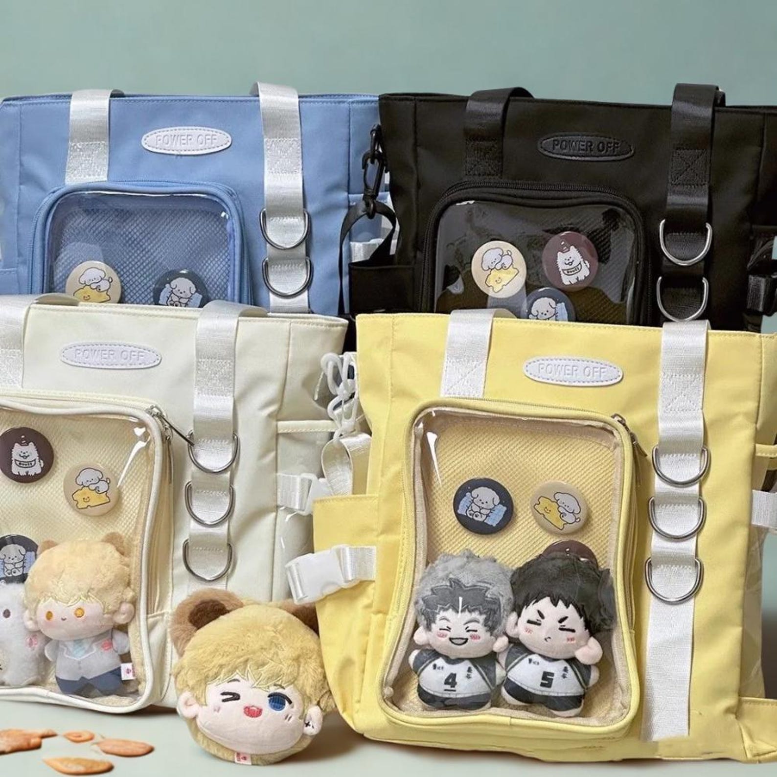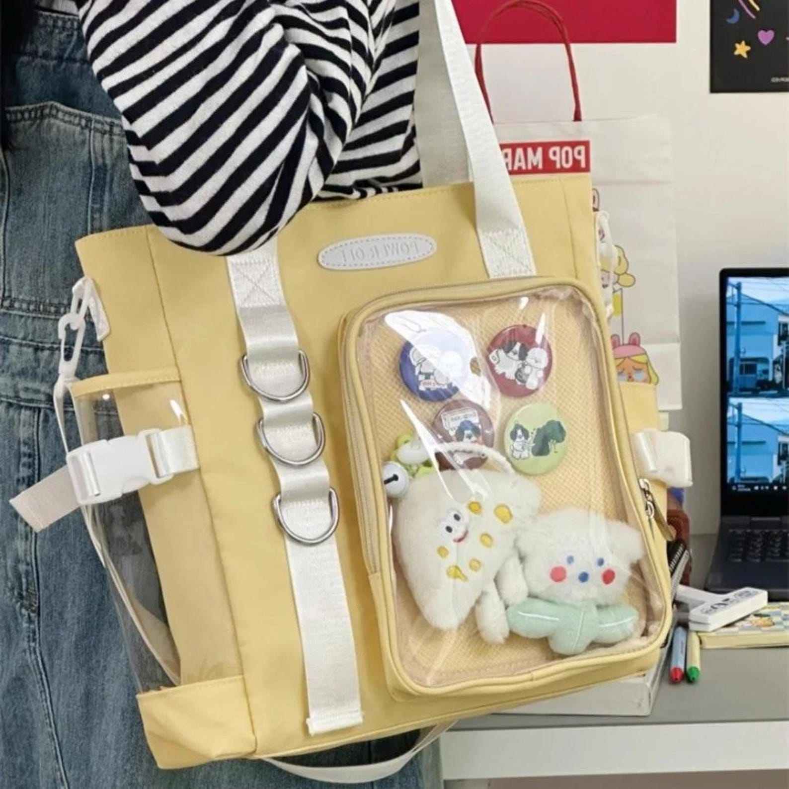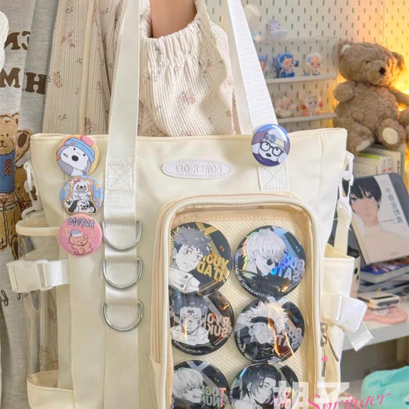 This Lolita Cute Japanese JK Ita Bag is designed for high school girls, students, and anime fashion lovers who enjoy showing off their style. Featuring a large transparent PVC display pocket, it’s perfect for displaying pins, charms, or DIY decorations, while carrying books, stationery, and daily essentials.