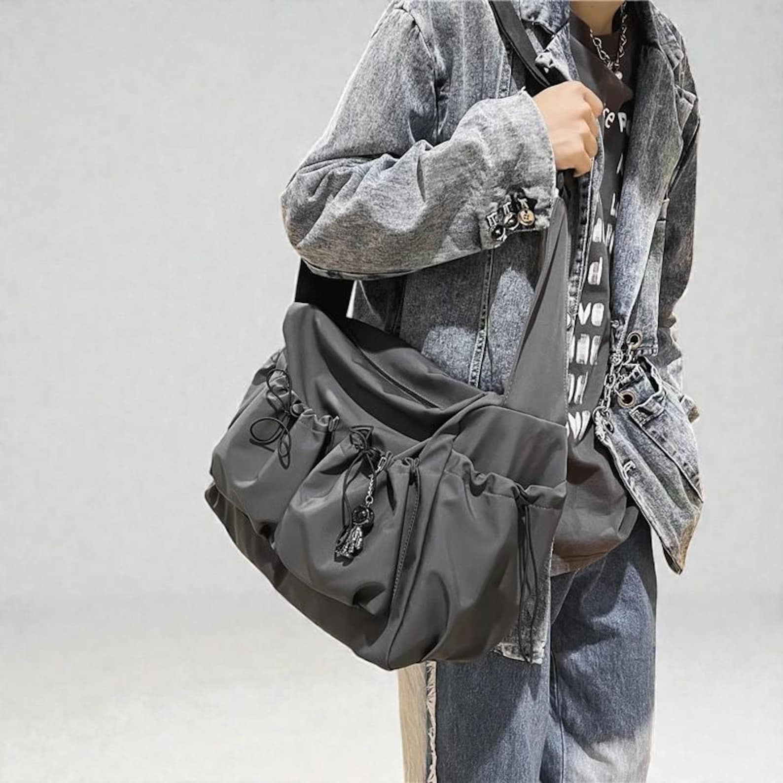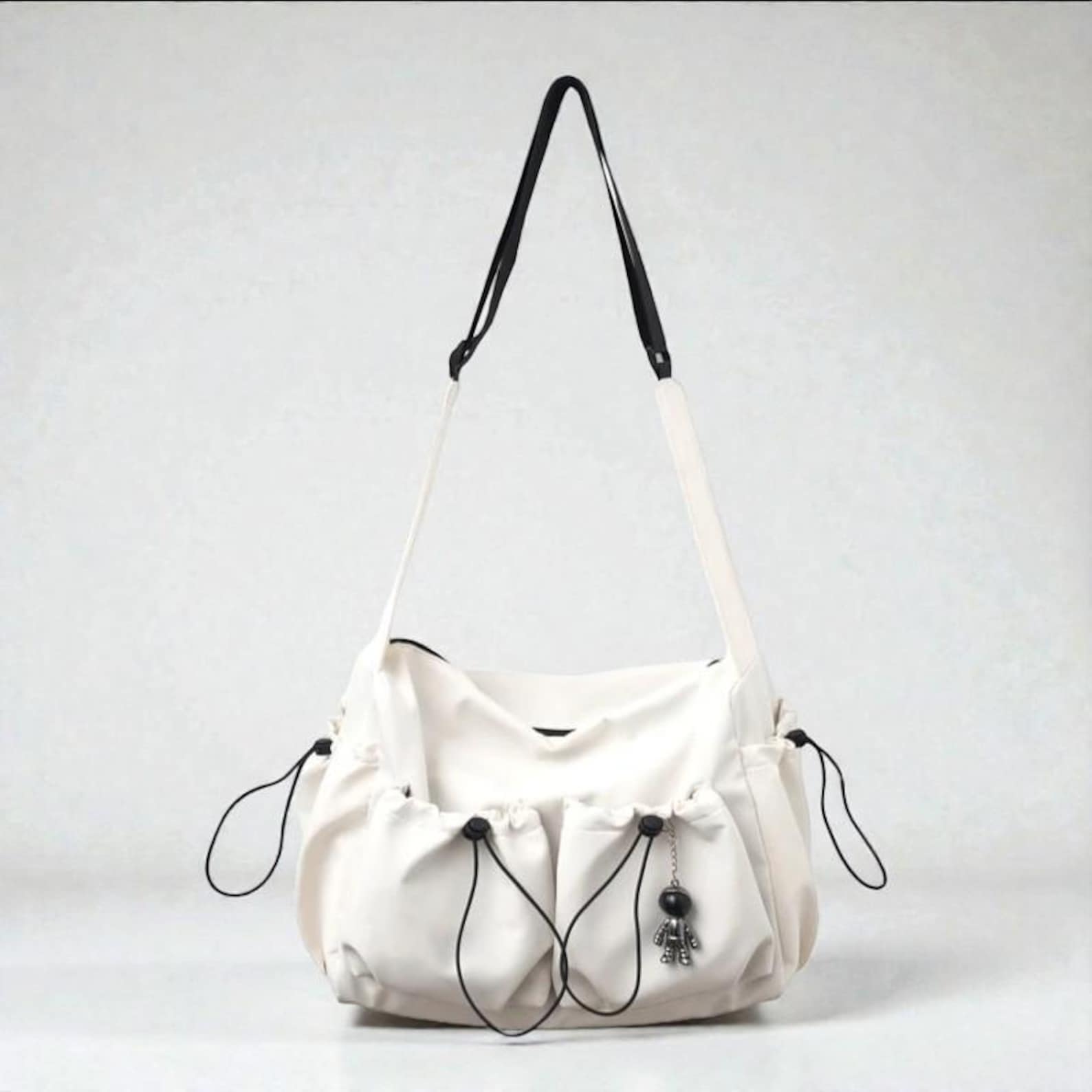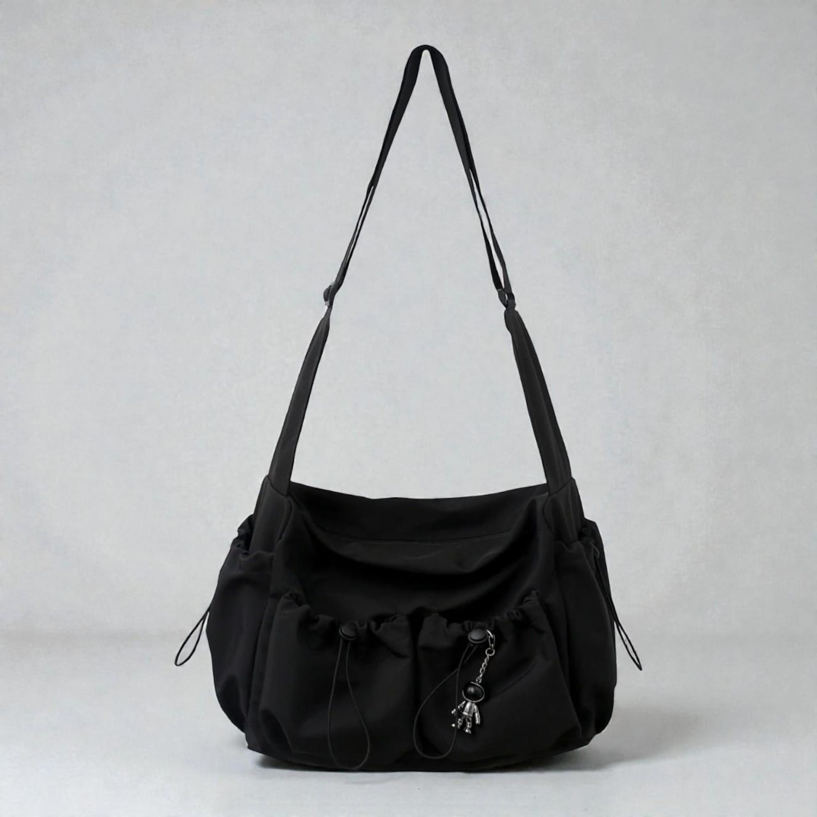 A versatile and functional everyday bag designed for students, commuters, and anyone who needs reliable style on the go. Crafted from durable nylon with a spacious layout, this crossbody satchel keeps your essentials organized and secure. The added bag charm brings a modern, stylish touch to elevate any outfit.