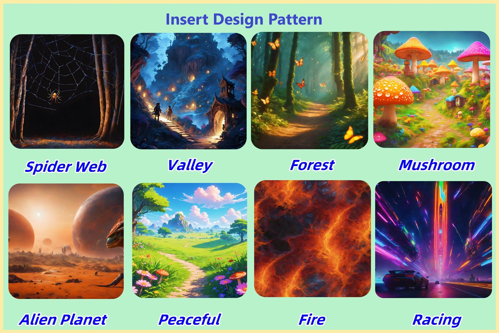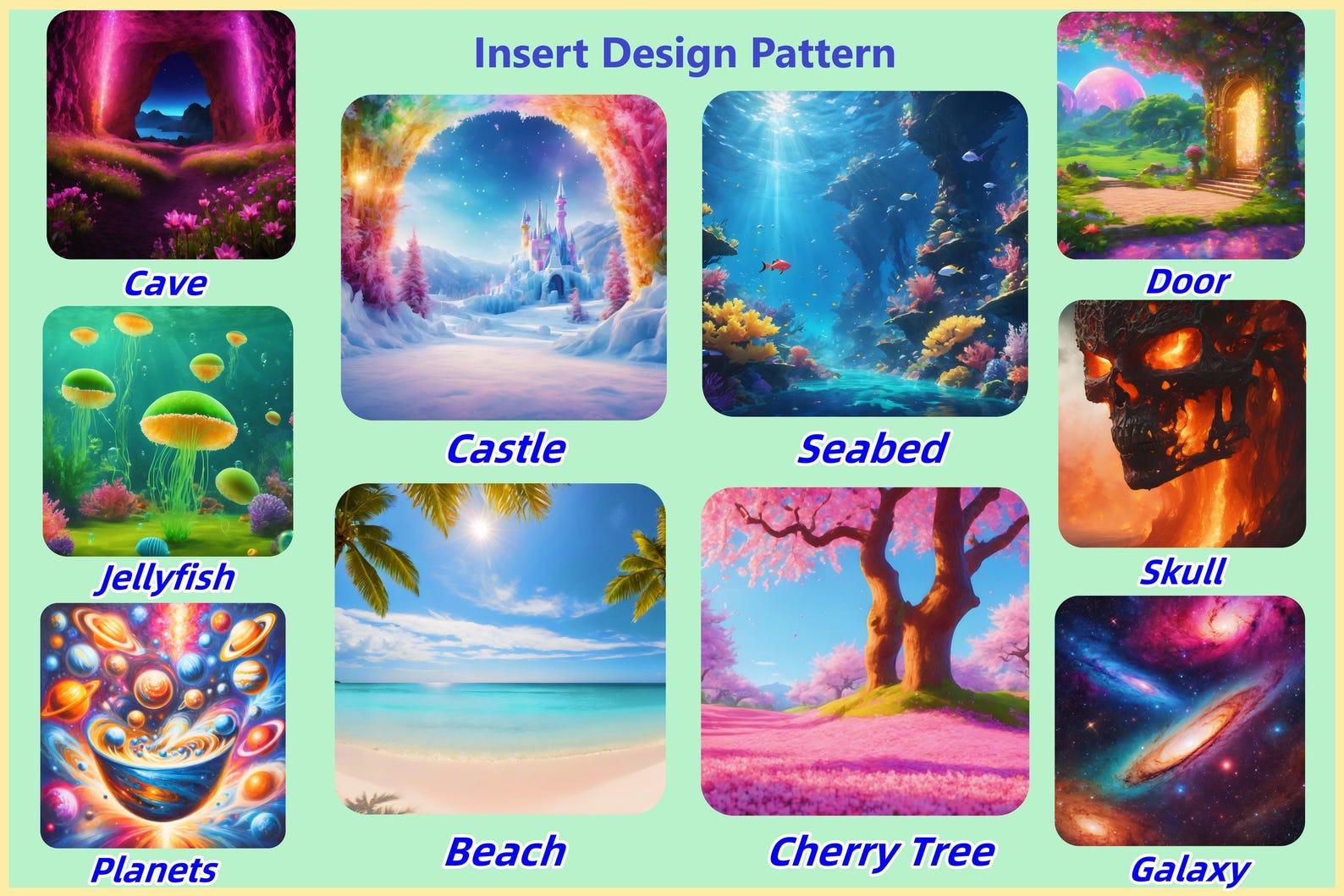 Each insert design is AI-generated and carefully refined by me to ensure a distinctive, high-quality artistic style — from dreamy forests and colorful mushrooms to fiery worlds and cosmic vibes.
