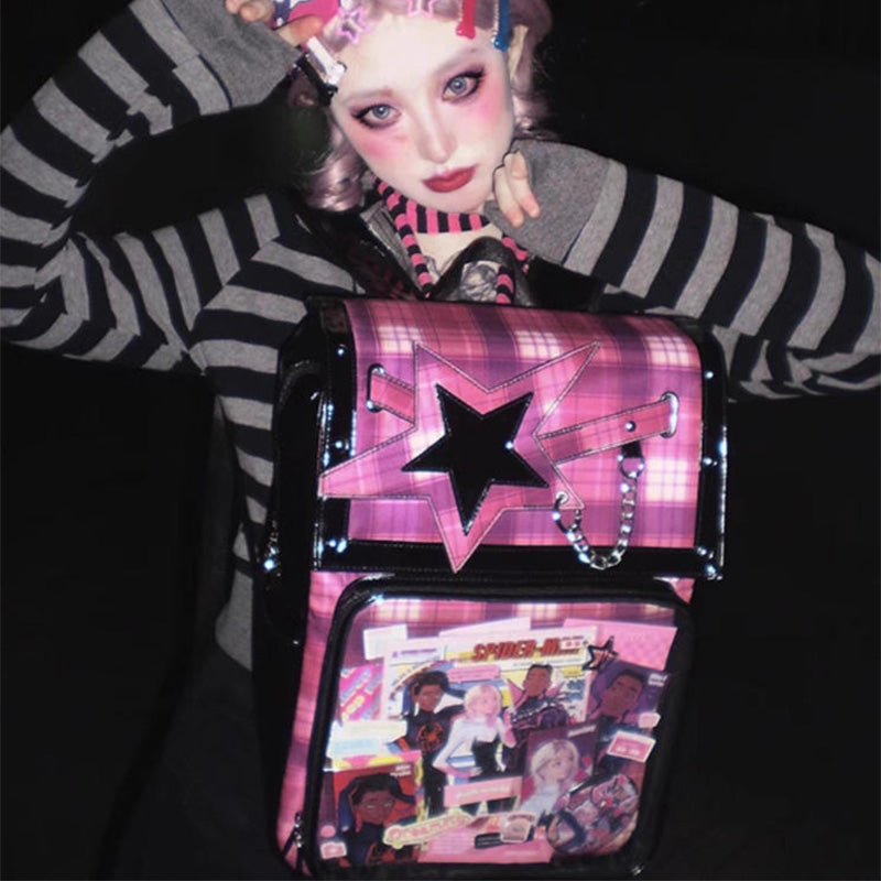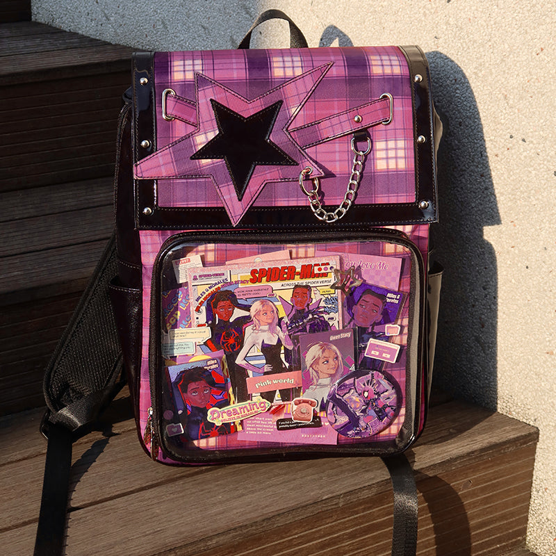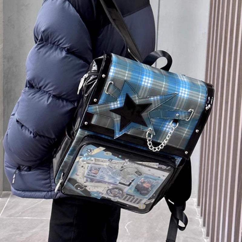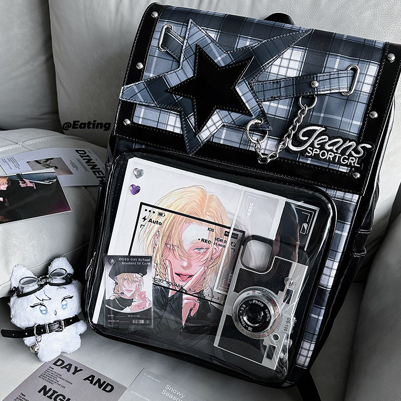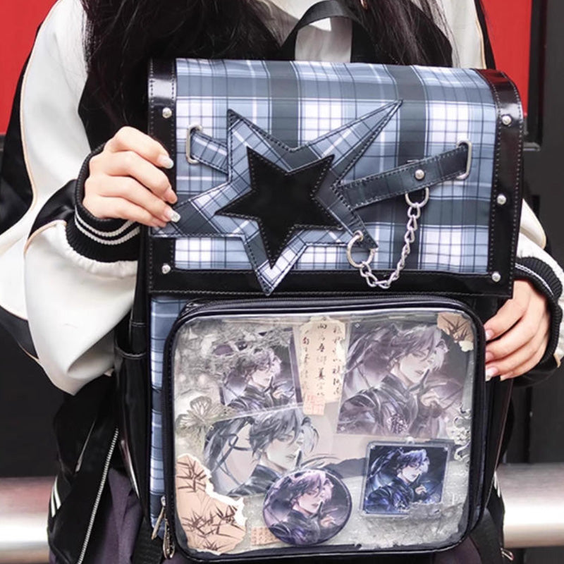 This large-capacity student ita backpack features a stylish star design and is perfect for displaying pins, badges, and other anime collectibles. Made with durable laminated nylon and PVC, it’s ideal for school, conventions, or everyday use. The spacious transparent window and insert make it easy to showcase your favorite items while keeping your essentials organized.