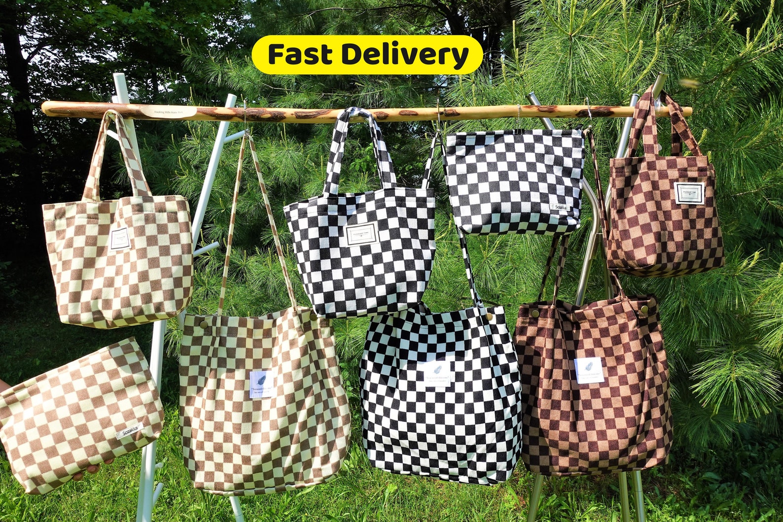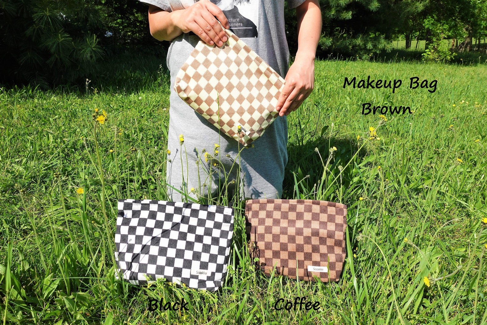 The corduroy bags have 3 colors and 3 different sizes that are large(Tote bag), medium(lunch bag), and small (makeup bag).
