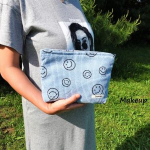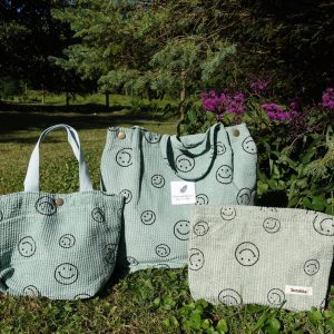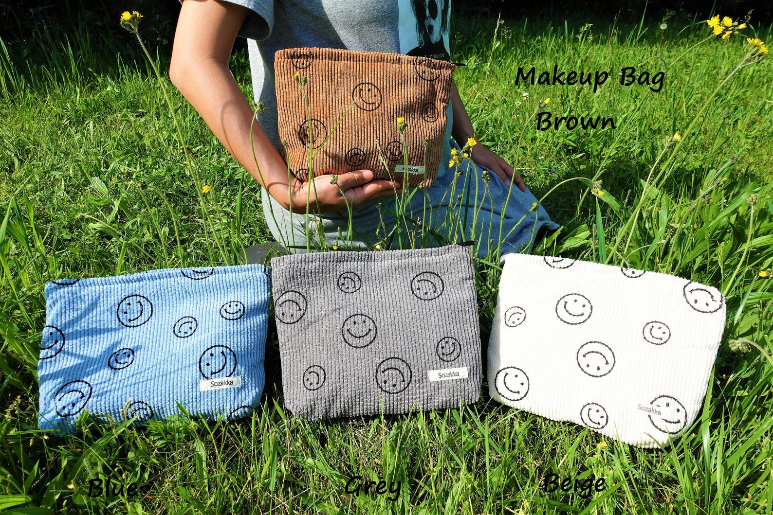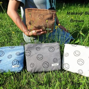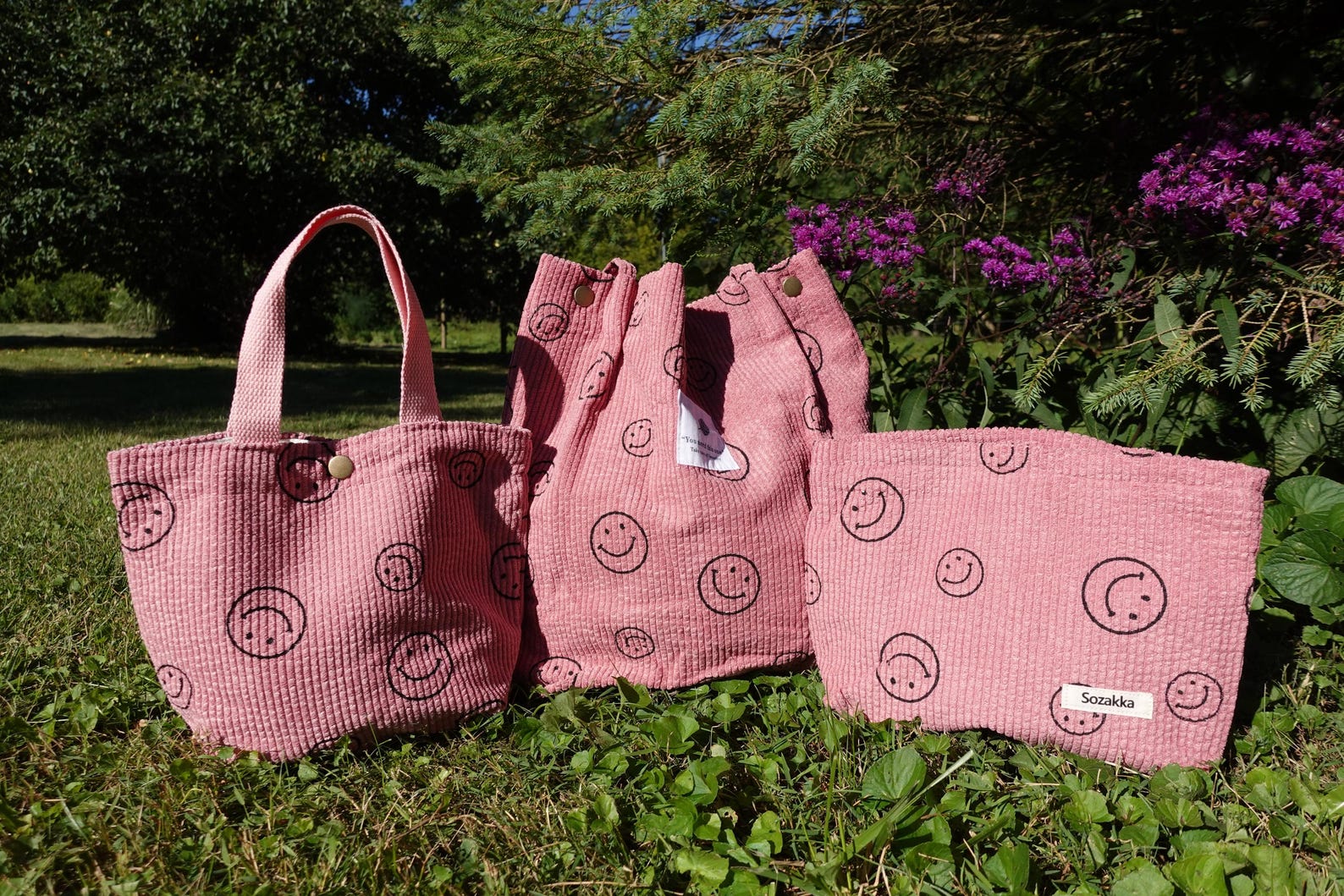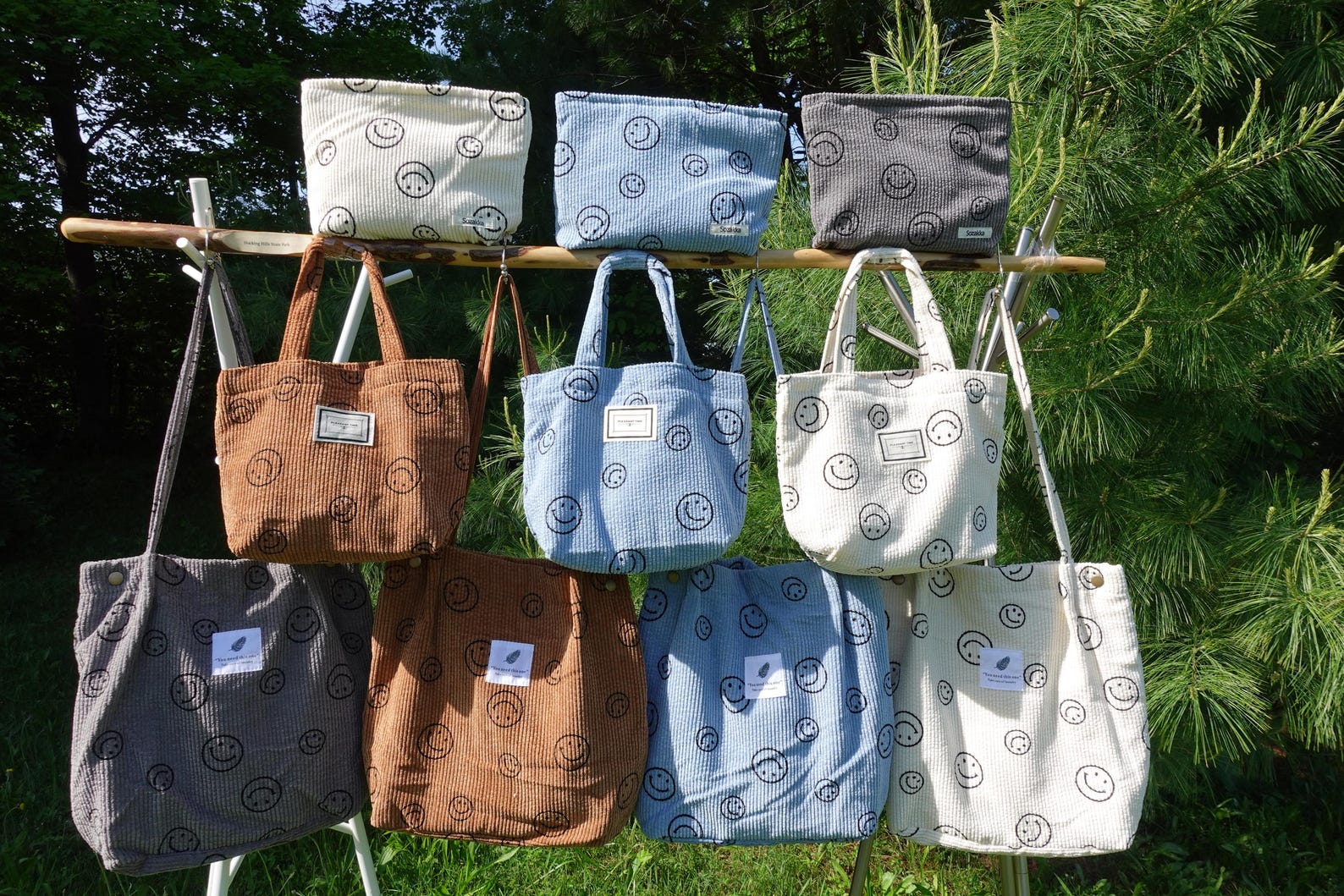 The corduroy bags have 6 colors and 3 different sizes that are large(Tote bag), medium(lunch bag), and small (makeup bag).