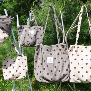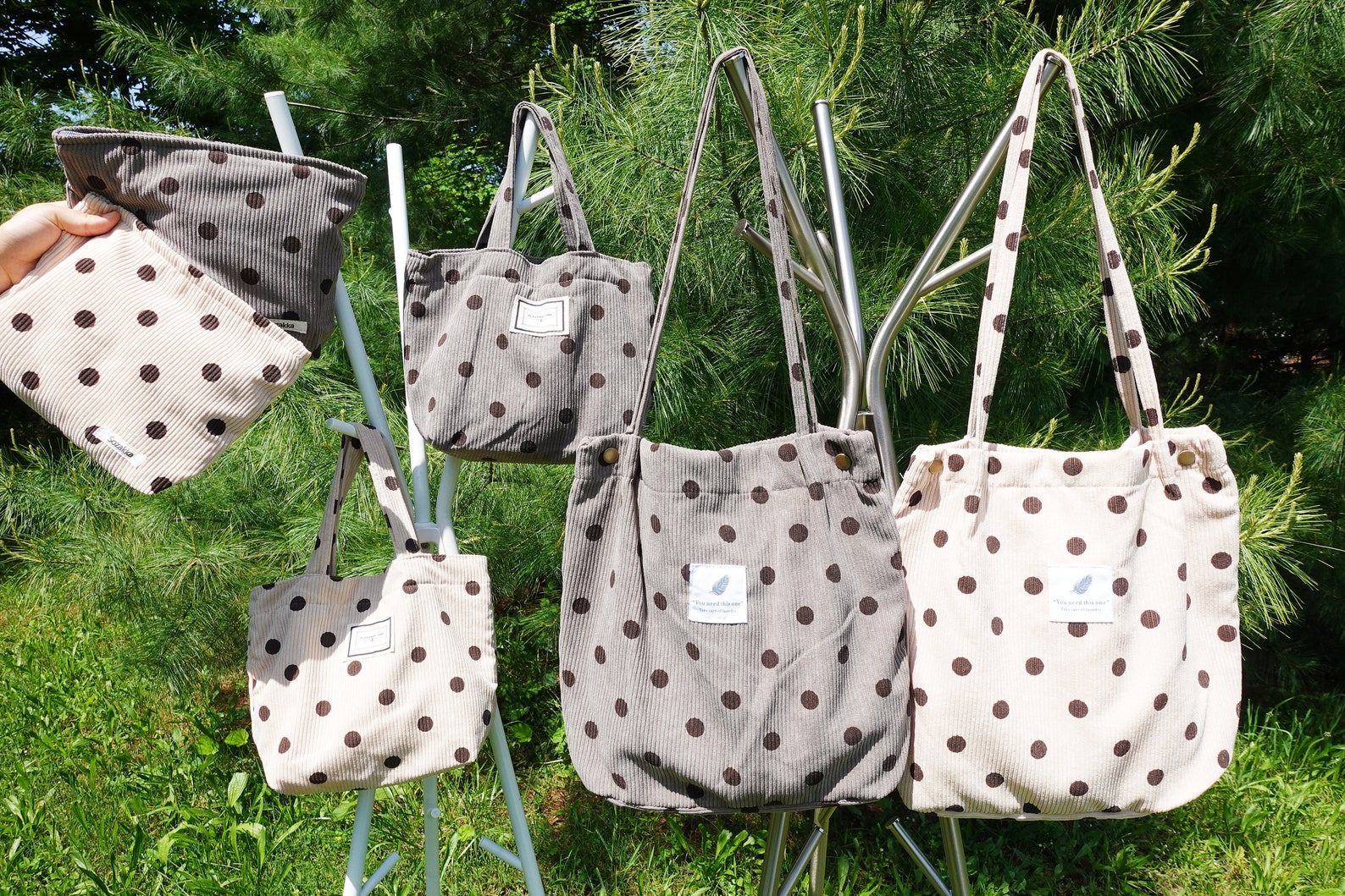 The corduroy bags have 2 colors and 3 different sizes that are large(Tote bag), medium(lunch bag), and small (makeup bag).