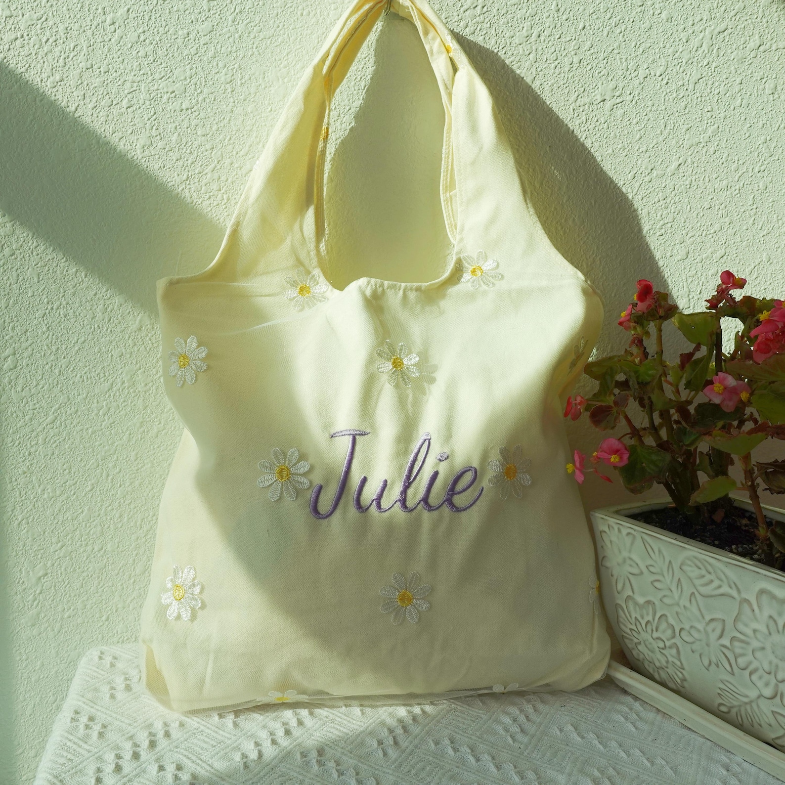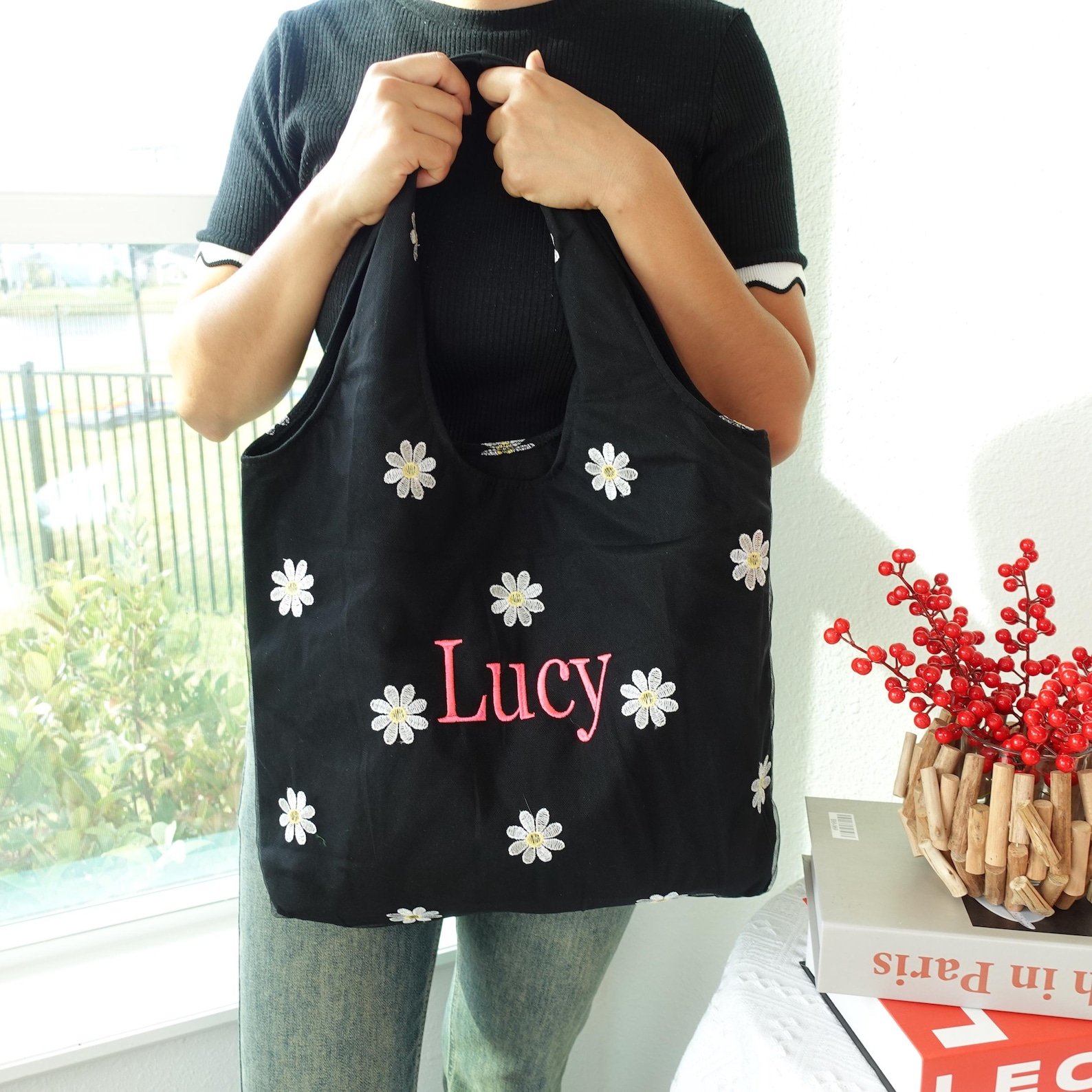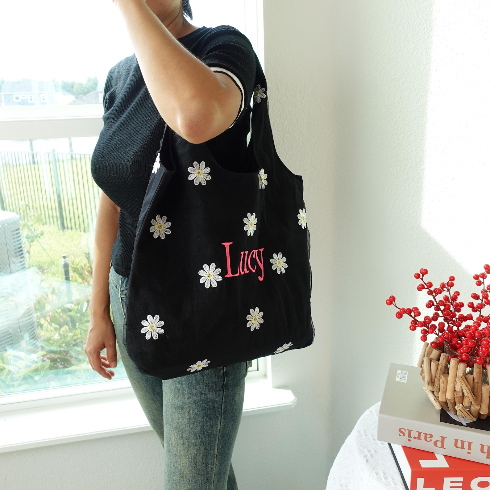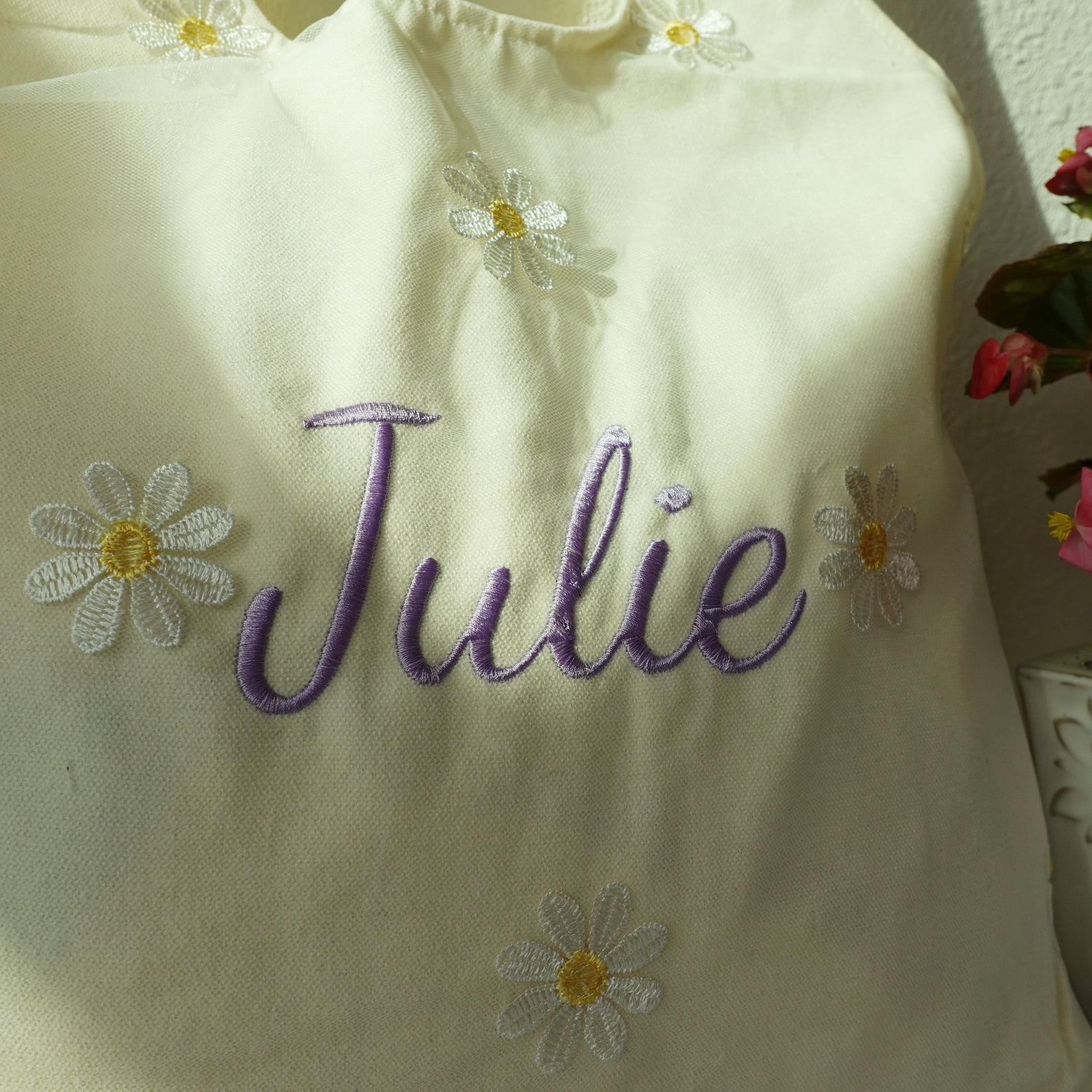 The Tote Bag is made of cotton that is lightweight. It’s medium, very roomy. It’s the perfect size to use as an everyday bag or casual. The sheer layer with the embroidered daisies is so cute too.