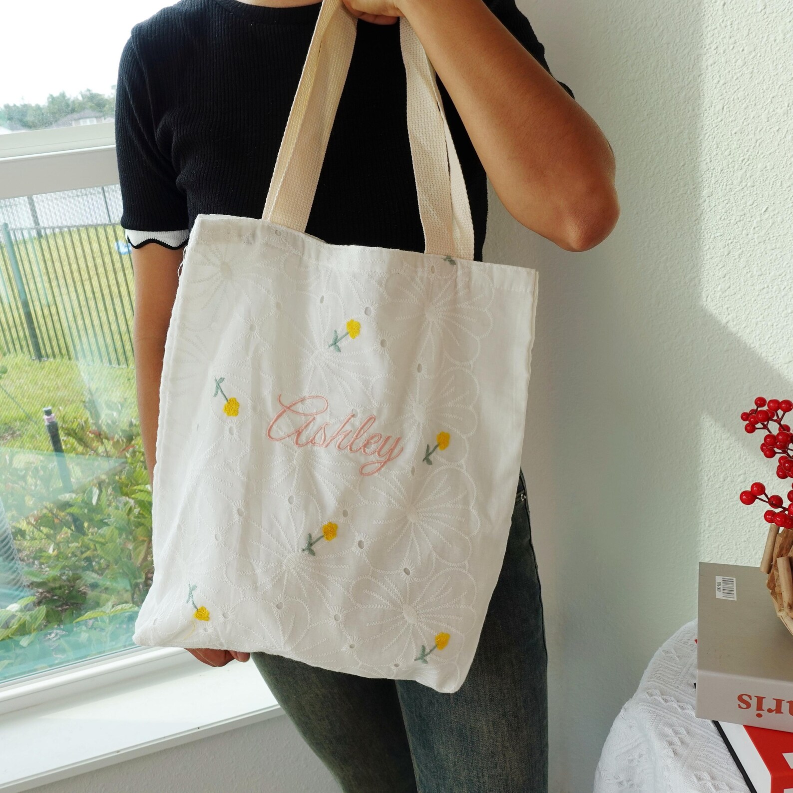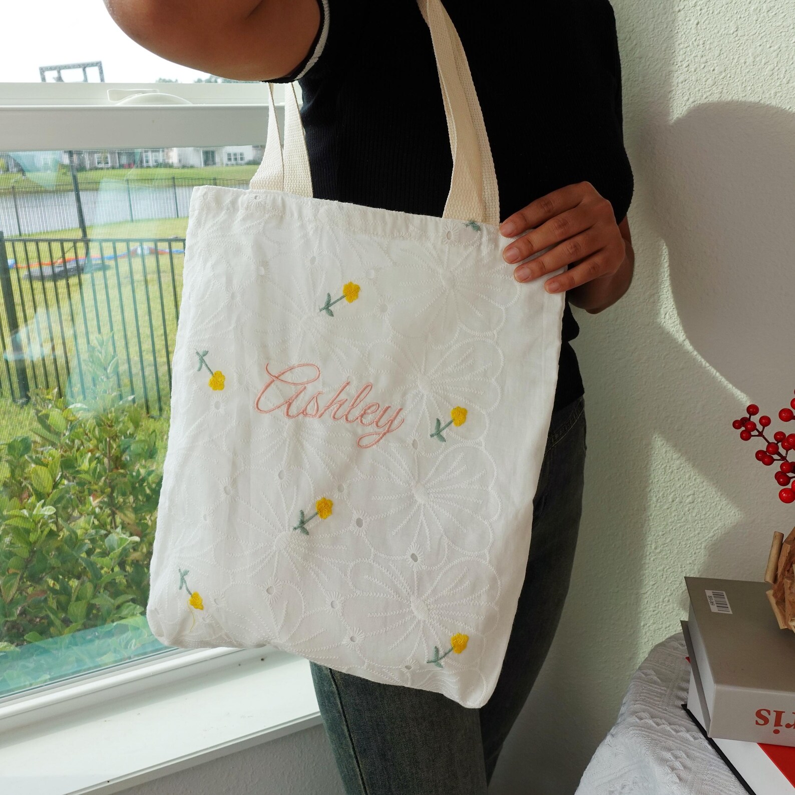 🌸 Features delicate floral embroidery with yellow flowers and custom name embroidery, making each bag unique and special.