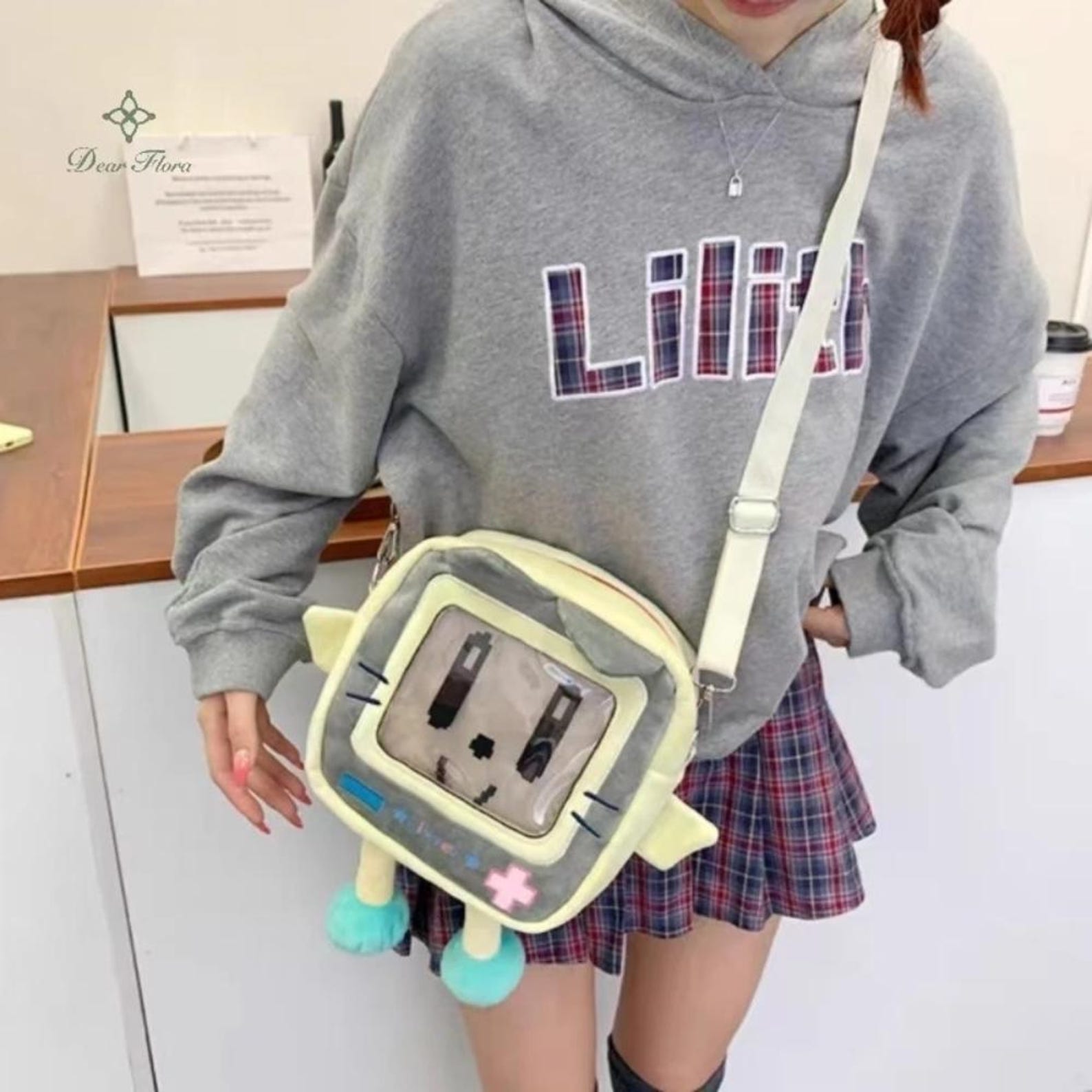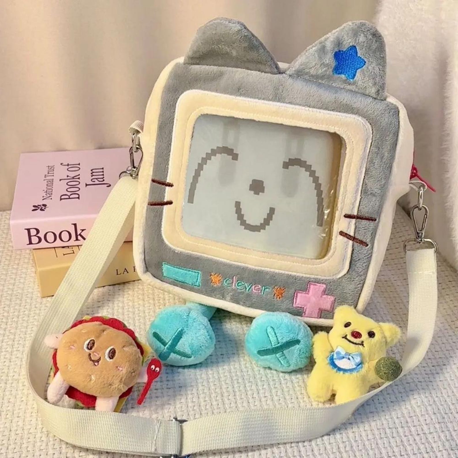 Bring fun and personality to your outfits with this Plush Smiling Cat Ita Bag. Designed in a cute square shape with soft plush fabric, this bag features a transparent display window perfect for showing off charms, pins, or cosplay inserts.