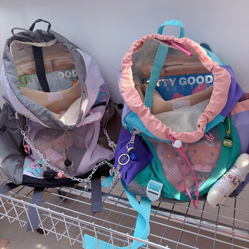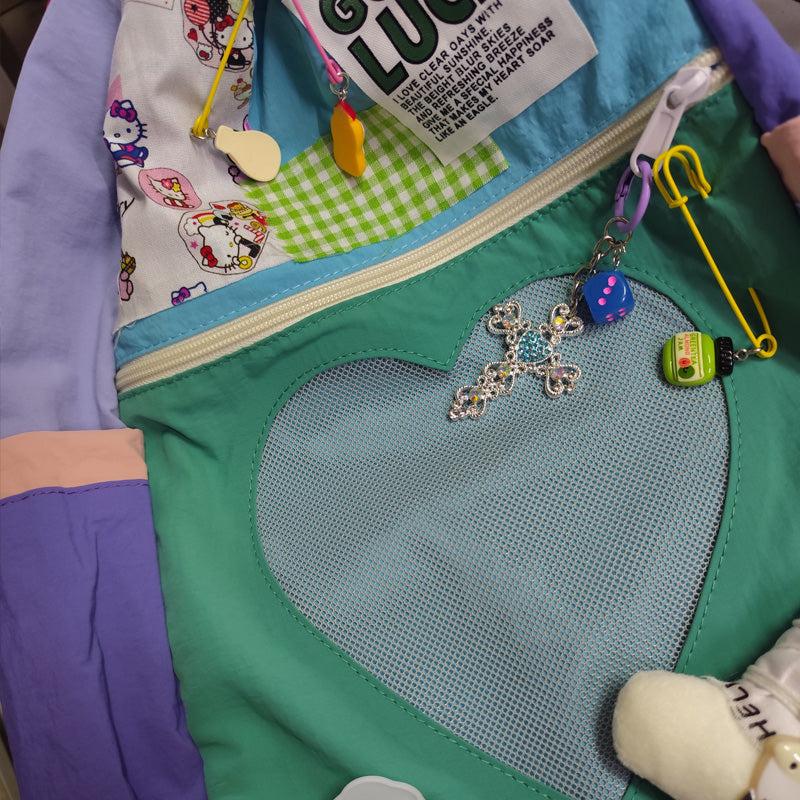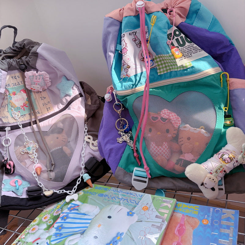 Retro Y2K style ita backpack with a sweet and edgy patchwork design. Features a roomy drawstring closure, side pocket for a water bottle, and an inner laptop compartment that fits A4 books or up to a 14-inch laptop.