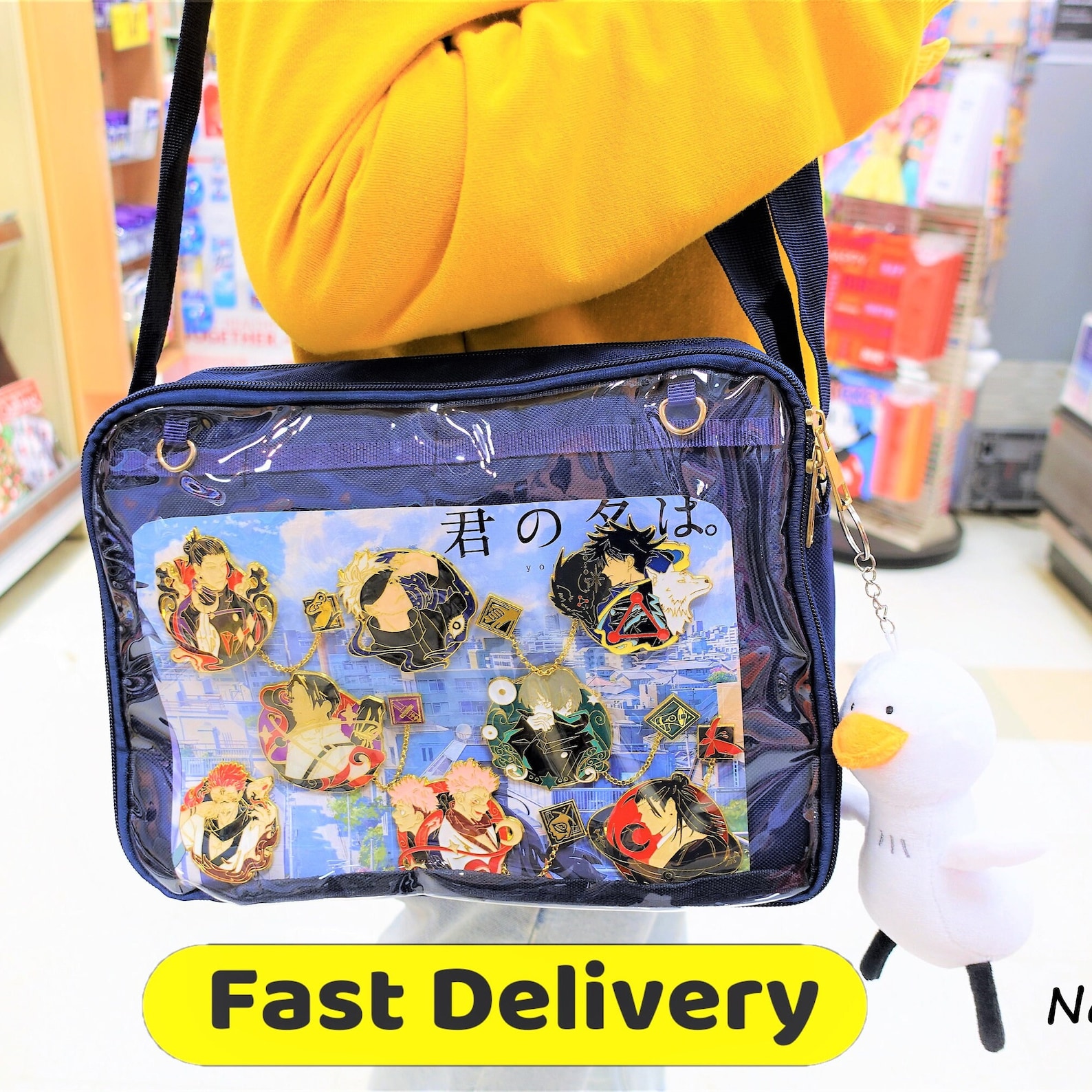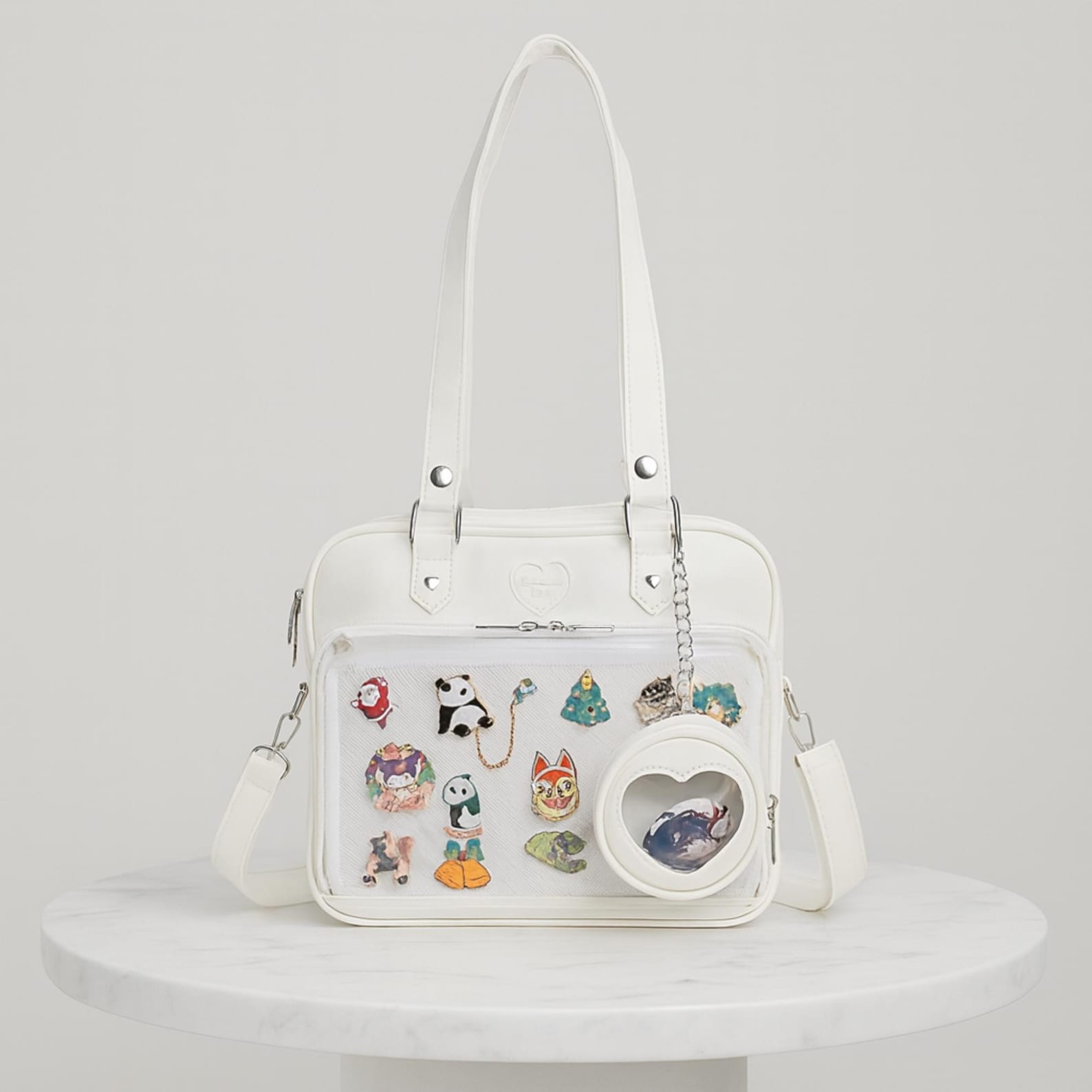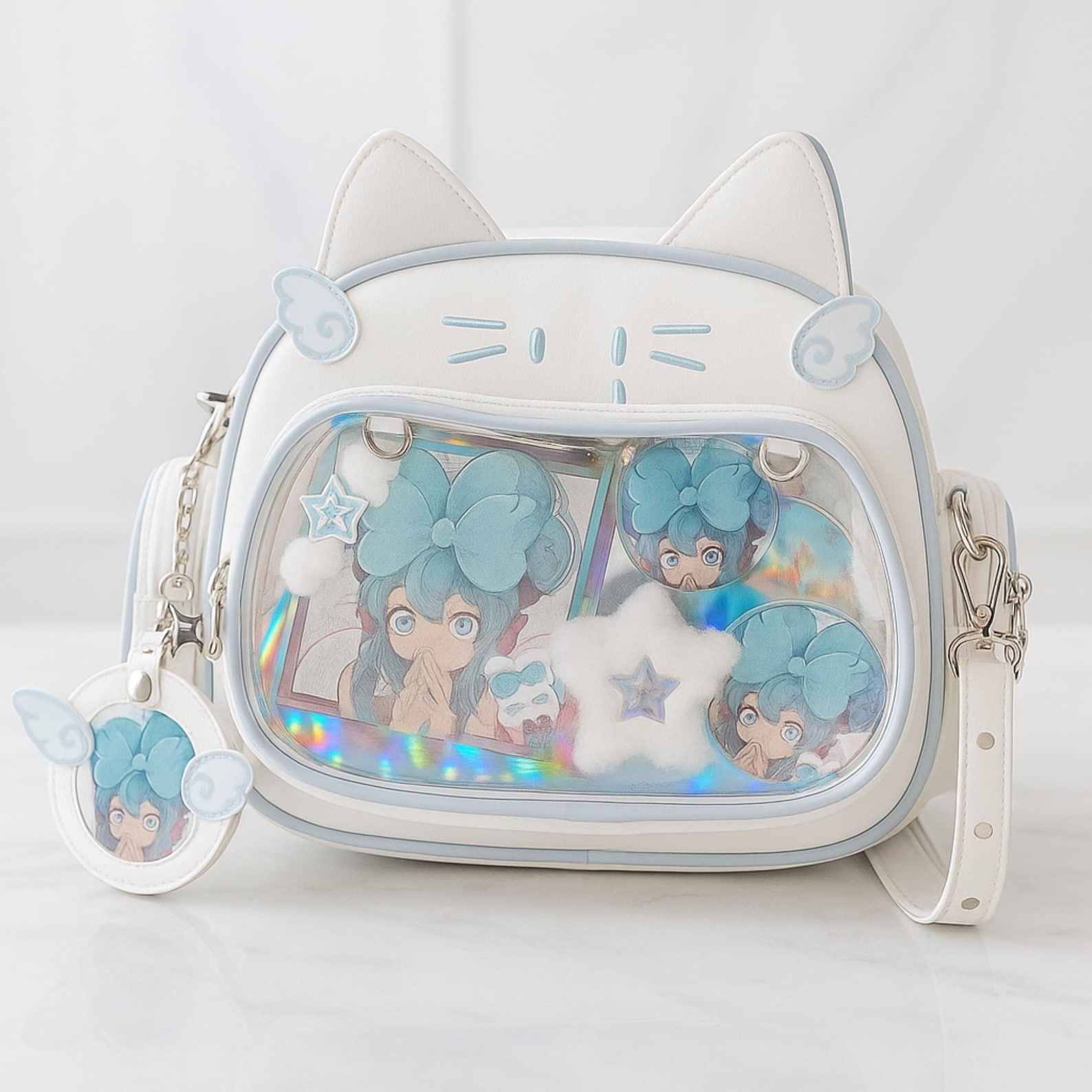 Express your style and display your favorite pins and charms with this elegant White Cat Ita Bag 🐾. Designed for collectors and fashion lovers, this bag features a clear protective window that keeps your items secure while showing off your unique personality. Whether for daily use, school, conventions, or casual outings, it combines practicality with a stylish, clean look 🤍.