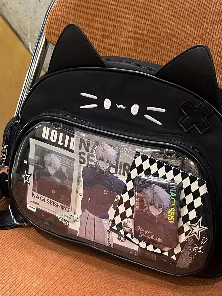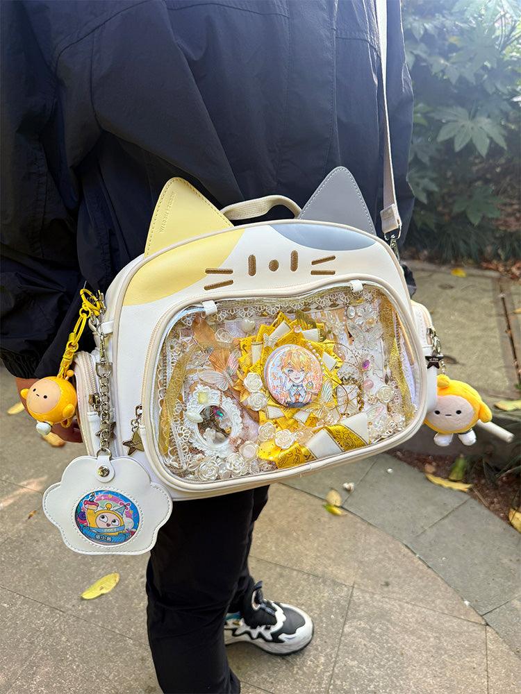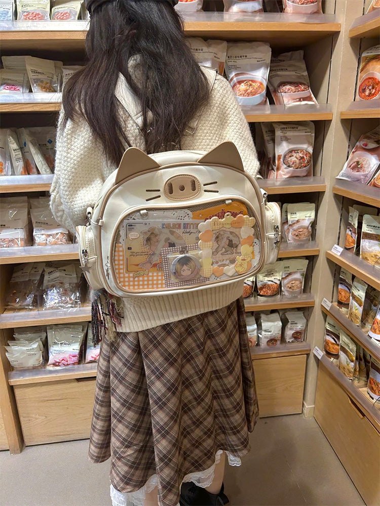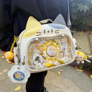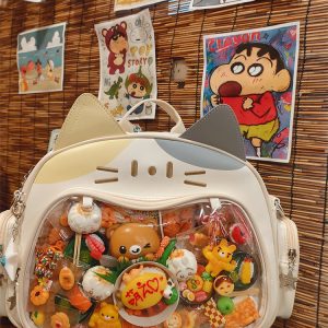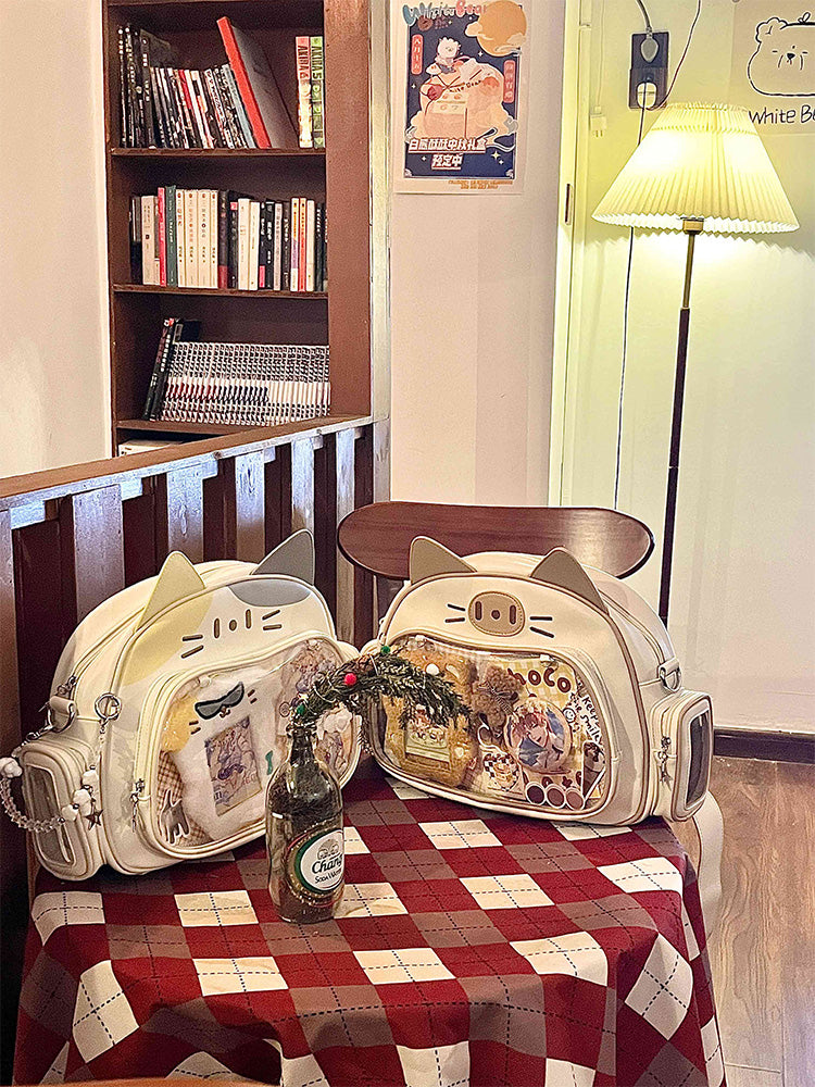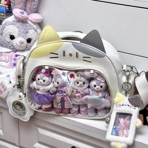 This cat-shaped ita bag is absolutely adorable! It can be worn as a shoulder bag, backpack, or carried by hand. The large capacity makes it perfect for daily use, and there’s a small side pocket that can hold dolls under 10 cm or small cards.